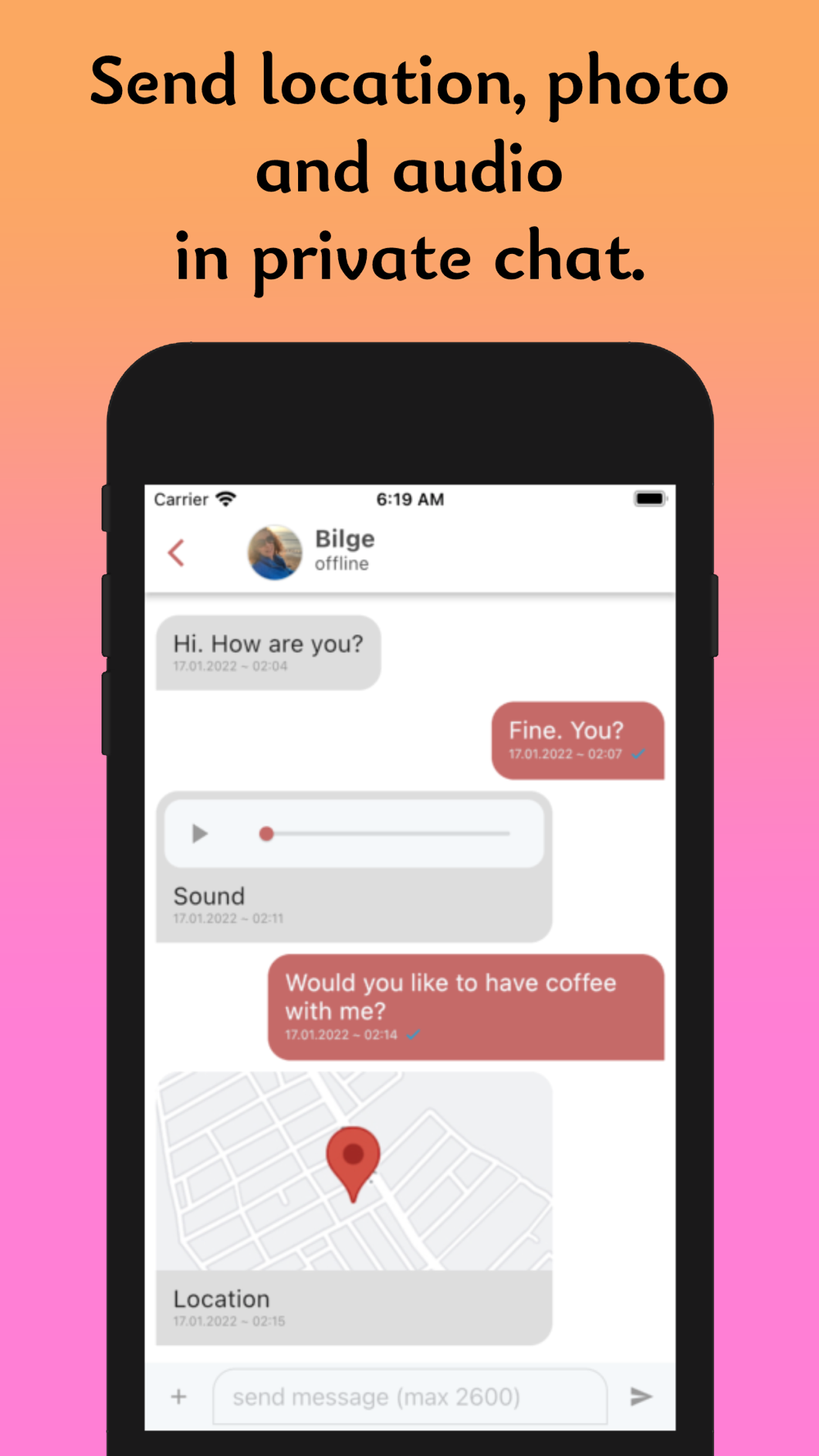 From within our application, you can view the posts made near you on the map, add a location to your posts and share your location in messaging. Thus, if you want to take your current friendship out of the virtual and have a coffee with each other, you can easily communicate.