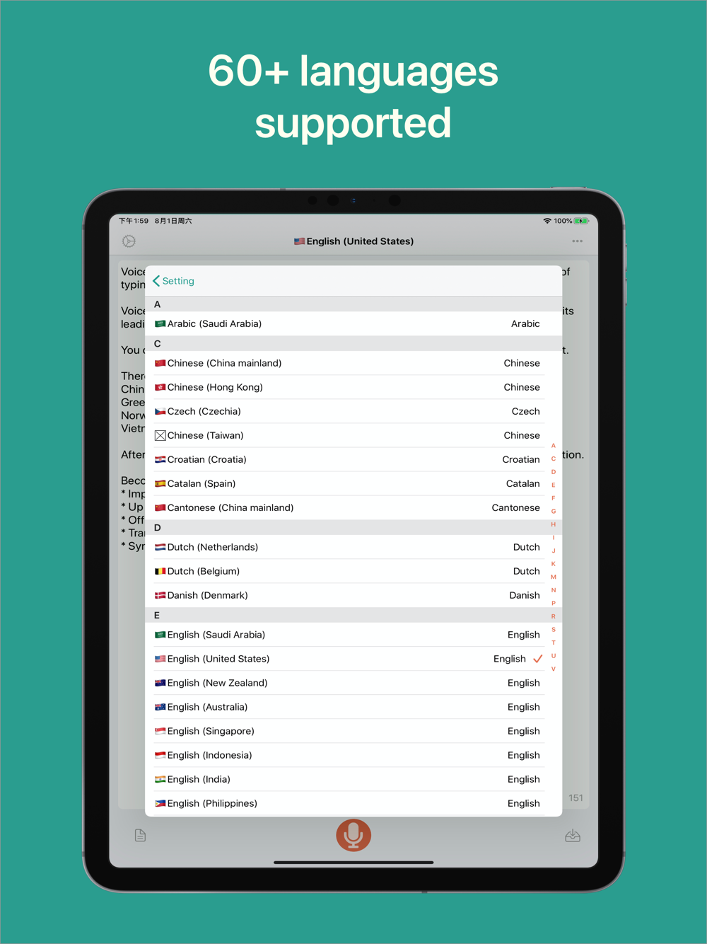 There are many languages you can choose to recognize your speech including English, Chinese, Arabic, Cantonese, Czech, Catalan, Croatian, Dutch, Danish, French, Finnish, Greek, German, Hebrew, Hindi, Hungarian, Italian, Indonesian, Japanese, Korean, Malay, Norwegian, Portuguese, Romanian, Russian, Spanish, Slovak, Thai, Turkish, Ukrainian, Vietnamese and so on.