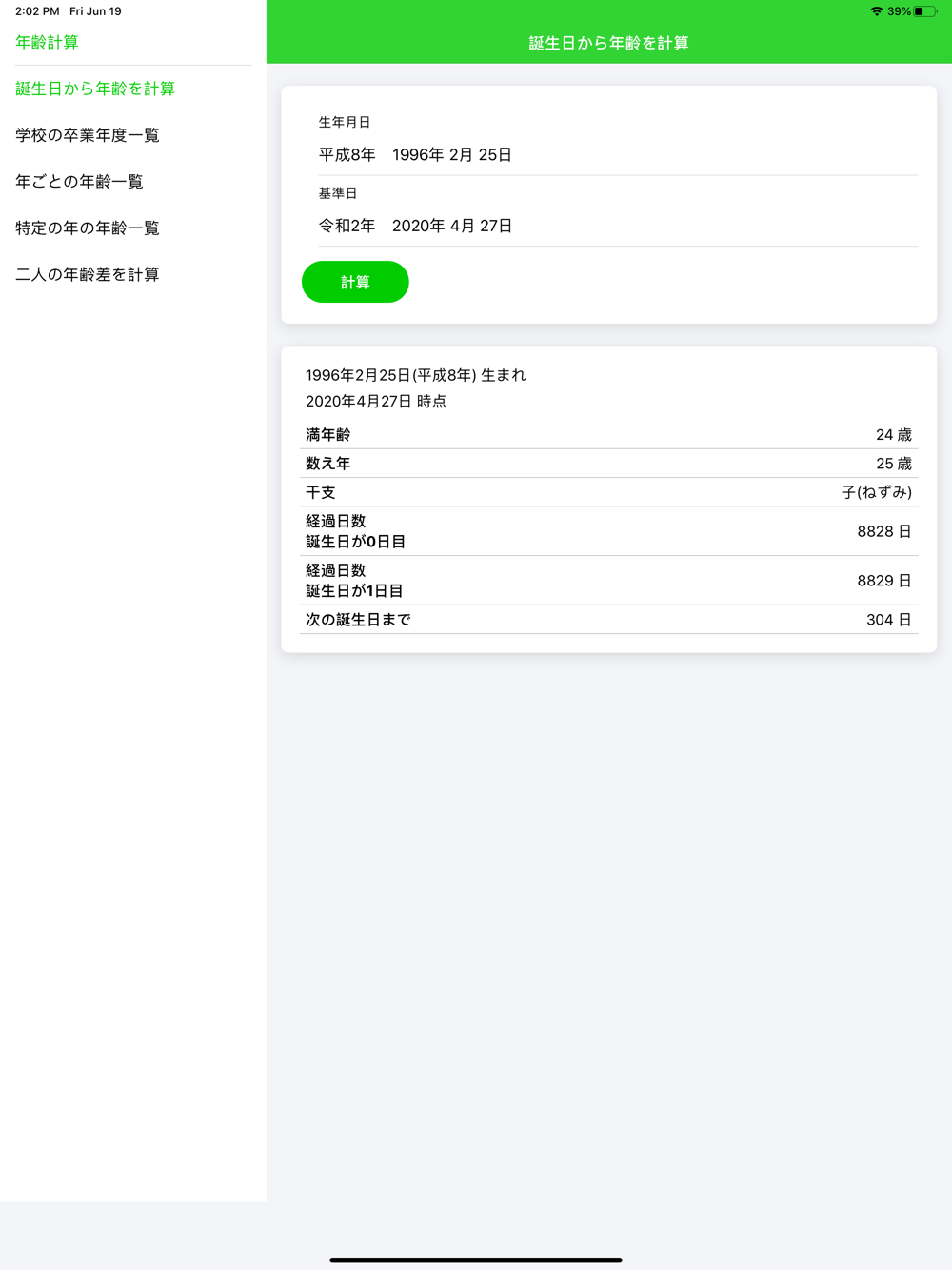 誕生日と基準日から、その時点での満年齢、数え年、干支や、誕生日からの経過日数や次の誕生日までの日数も確認できます。