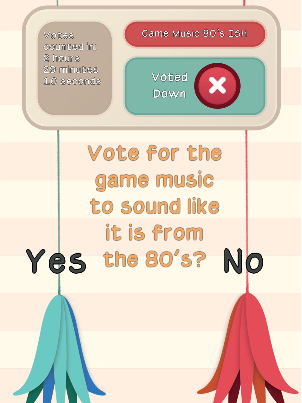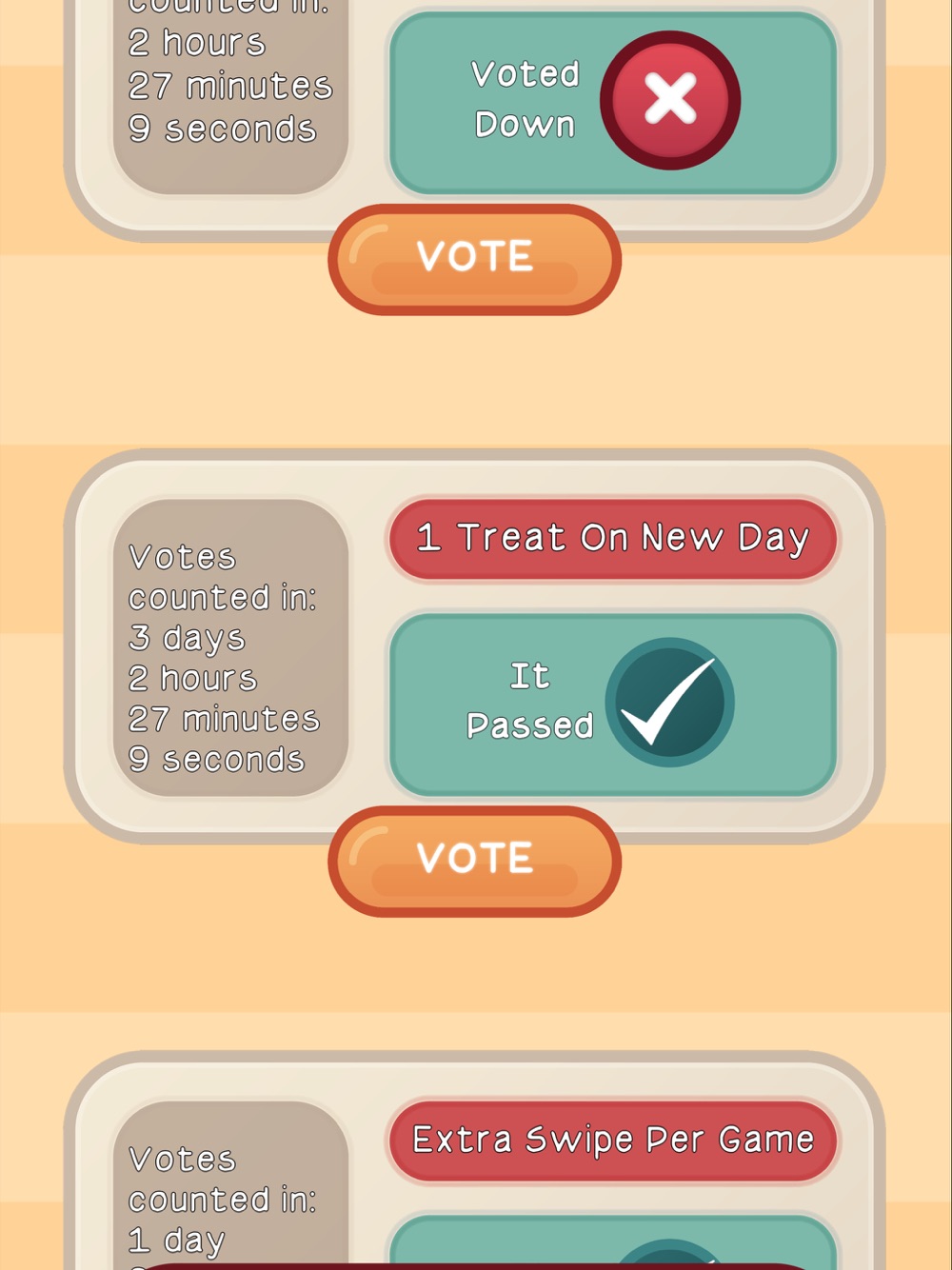 Cats Your Vote is a free-to-play social mobile game that aims to increase voter awareness of the 2020 U.S. election. A massively-single player game, it encourages collective action, and explores short-sighted vs. far-sighted decision making, living with the results, and potentially, voter regret.