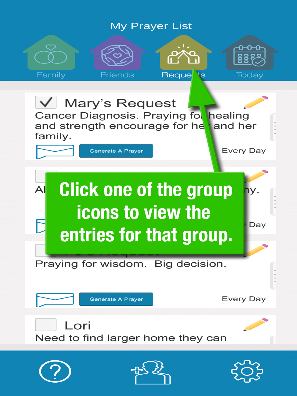 - You will have three initial categories to help sort your prayer entries. There is also the TODAY category that opens automatically the first time you start the app each day. Here you see every prayer entry you have scheduled to remember to pray for today. After praying for them, tap to check the box to signify that you have prayed for them today.