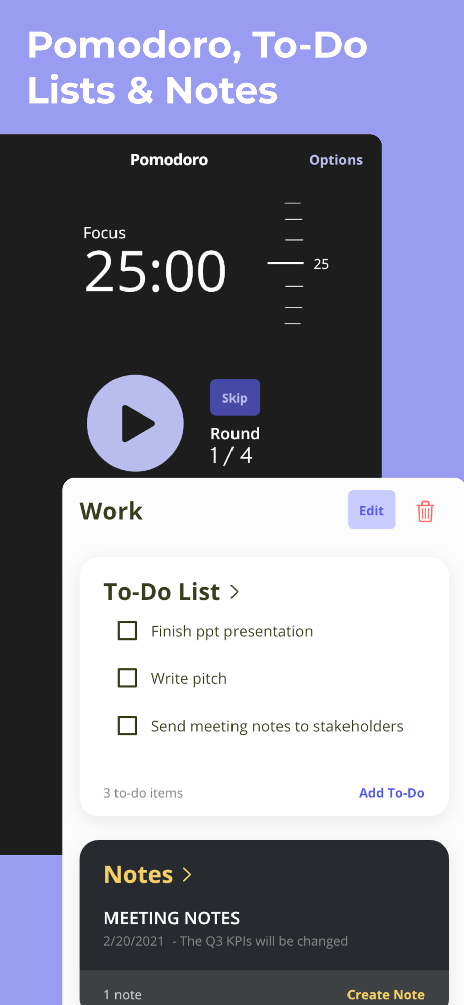 ◦ Focus timer: open the Pomodoro timer to apply the Pomodoro technique, set how long are the focus rounds, short breaks, and long breaks (the classic 25-10-30 technique or custom like 60 30 30)