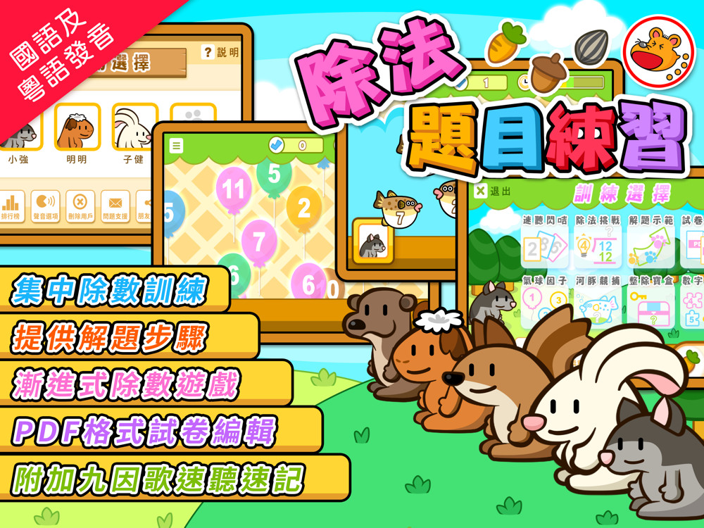 除法題目練習,是乘除數學訓練系列之一,通過有趣的重點訓練遊戲練習、多種除數題目設定訓練、以及解題示範器和試卷編輯器等,全方位強化兒童對除數的運算能力。