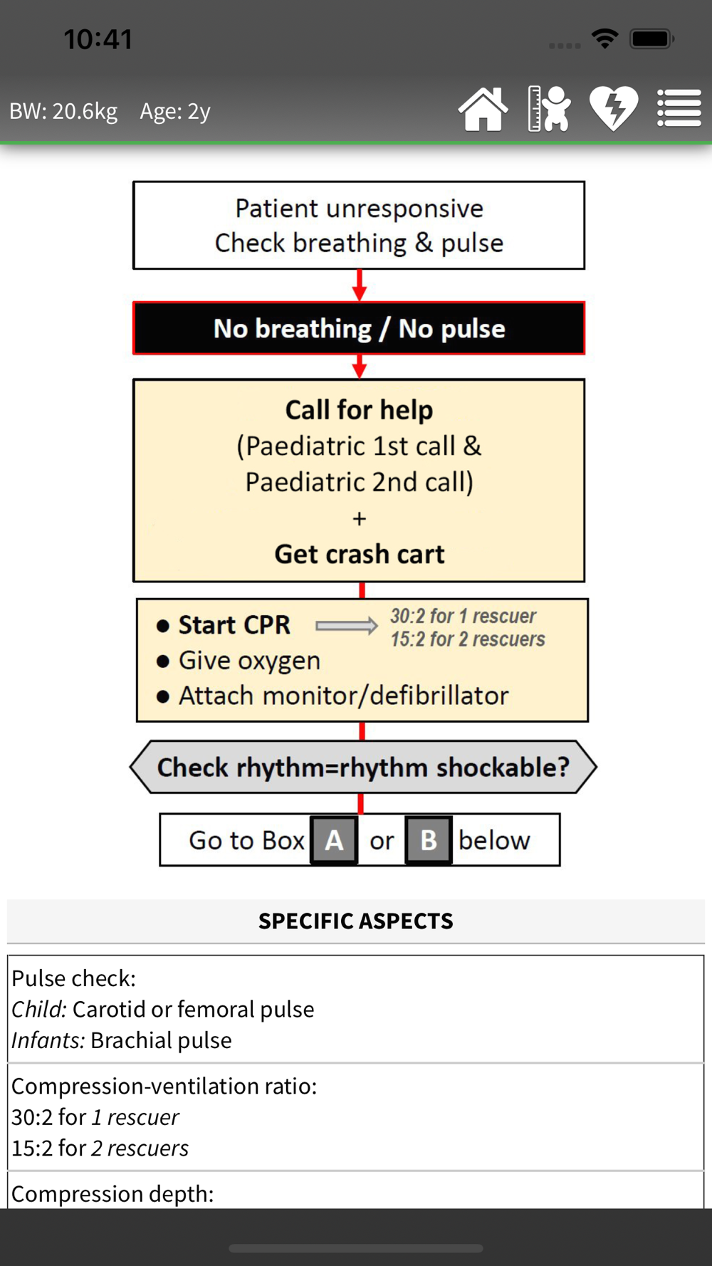 Additional functions: A body weight estimation tool is available to estimate the patient's body weight based on body length/height or age, according to local growth chart data. Additional reference information on management of paediatric cardiac arrest is available via the additional function buttons on the top-right corner.