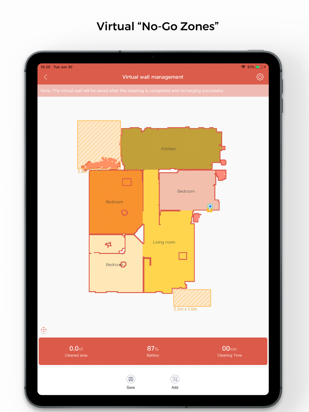3. Virtual “No-go zone”. Construct virtual walls on the APP to keep the robot vacuum from crossing some particular zones. Protect your daily life and stuff that you do not want disturbed.