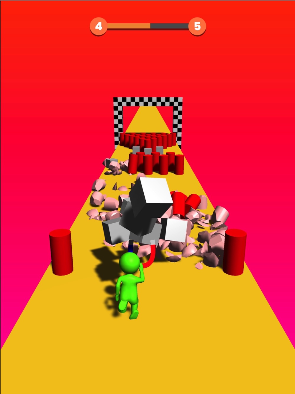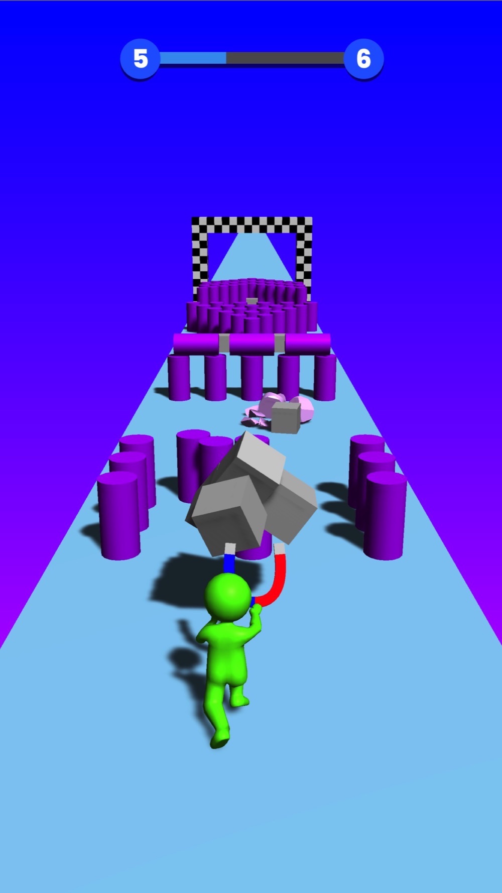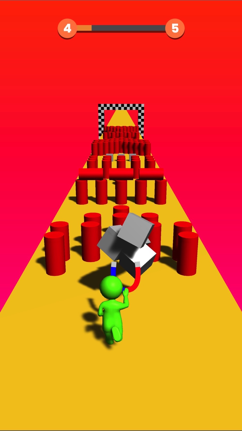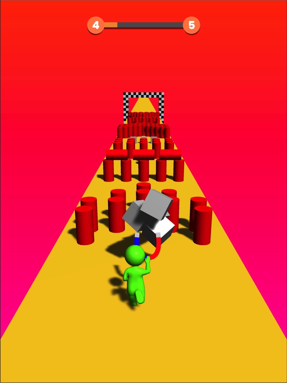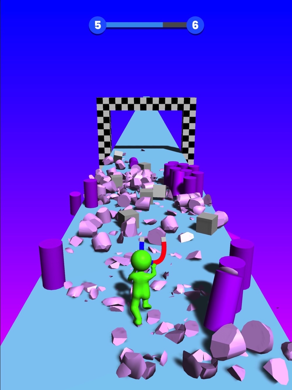 Use the magnet to collect items and throw them forward, cleaning your way through the level.
