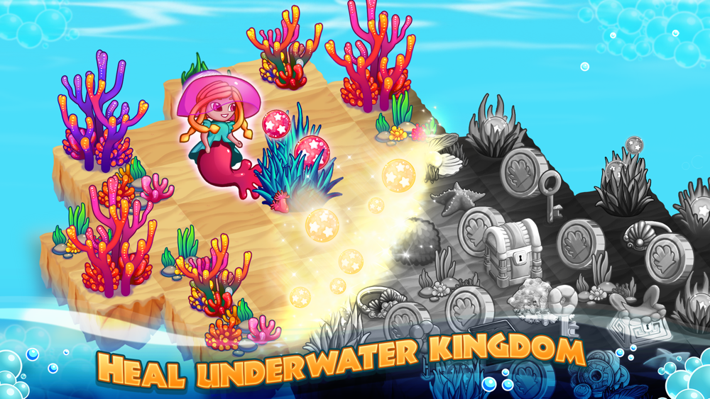 Once upon a time … Mermaids and tritons were living peacefully in their ocean kingdom until evil creatures started to pollute their environment with toxic oily substances! In order to prevent collapse of their kingdom and take back their territory, they have to clear it using Healing Orbs and fight off monsters spreading more toxic pollution.The kingdom is under attack and YOU are its only hope to revive the ocean land back to life!