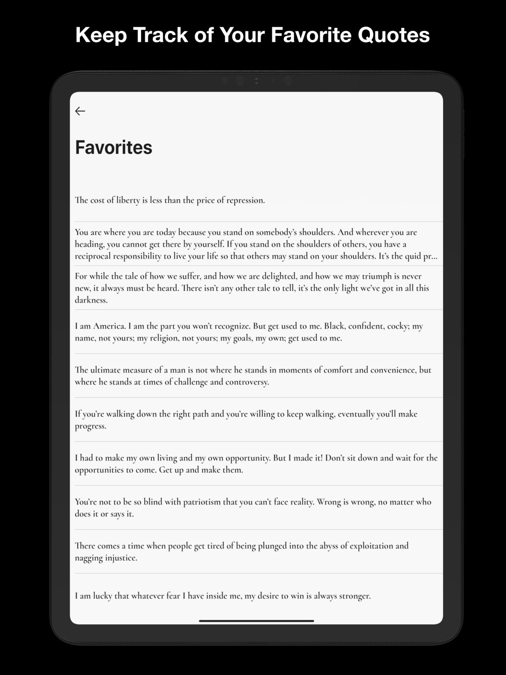 Instead of waking up and checking social media, check the uplifting messages on Power Quotes. Be inspired by history's greatest Black authors, musicians, leaders, athletes, activists, poets, politicians, CEO's, revolutionaries, and presidents. Easily share impactful quotes to social media, or text them to friends and family. Favorite the quotes that speak to you and refer back to them for inspiration.