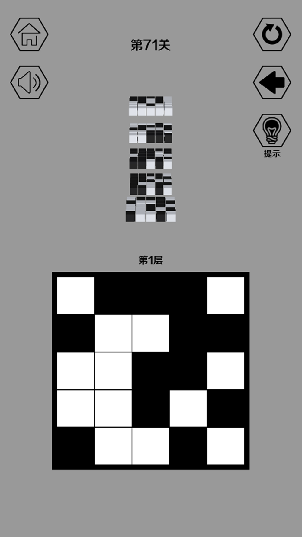 玩法:点击游戏内的任意一个格子,格子本身和其同平面的上下左右共5个格子将反色,原来是黑色的变为白色,原来是白色的变为黑色。另外,在3维环境下对应的上下层格子也将反色,在此玩法基础上玩家消除所有黑色格子即为游戏胜利。