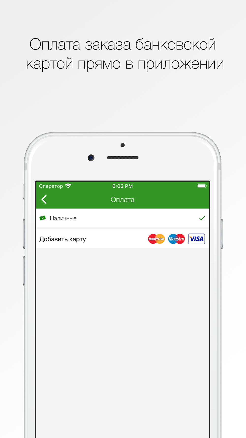 Выберите способ оплаты: Наличными или картой. Примите правила оплаты и нажмите кнопку “Заказать”.