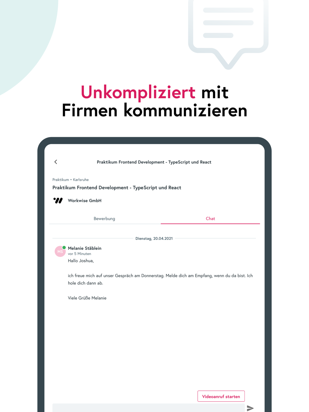 - Einfache Kommunikation: Über unsere Plattform kannst du dich schnell und unkompliziert mit dem Unternehmen austauschen. Lange Wartezeiten auf die Antwort des Unternehmens waren gestern.