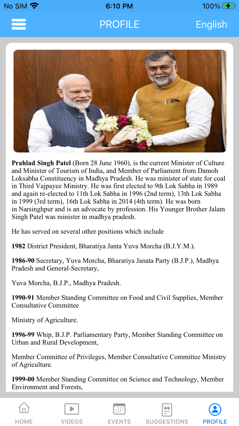 Prahlad Patel app is a social platform that brings to you latest information, instant updates, videos, images and all the current happenings of Shri Prahlad Singh Patel (the current Minister of Culture and Minister of Tourism of India, and Member of Parliament from Damoh Loksabha Constituency in Madhya Pradesh).