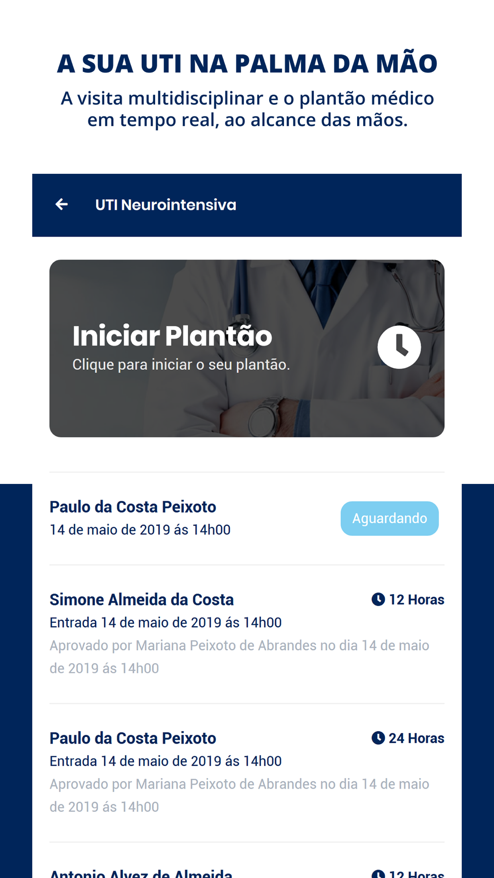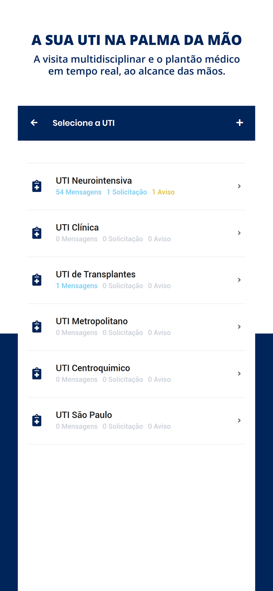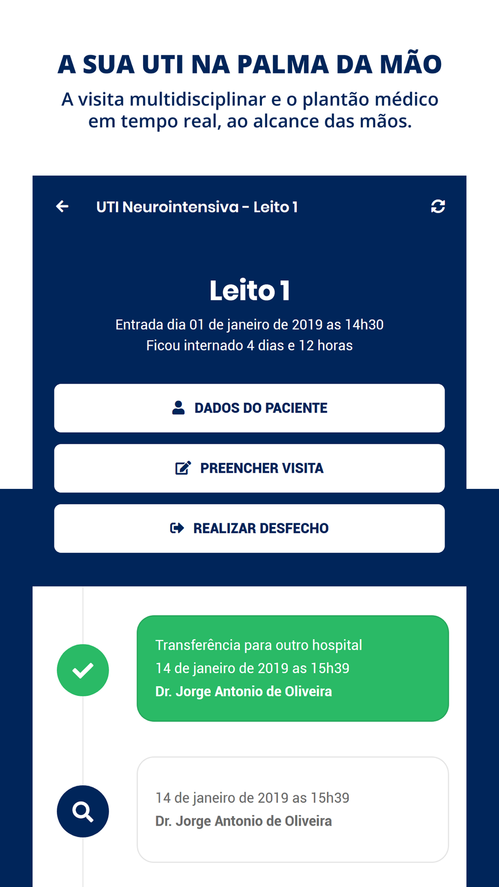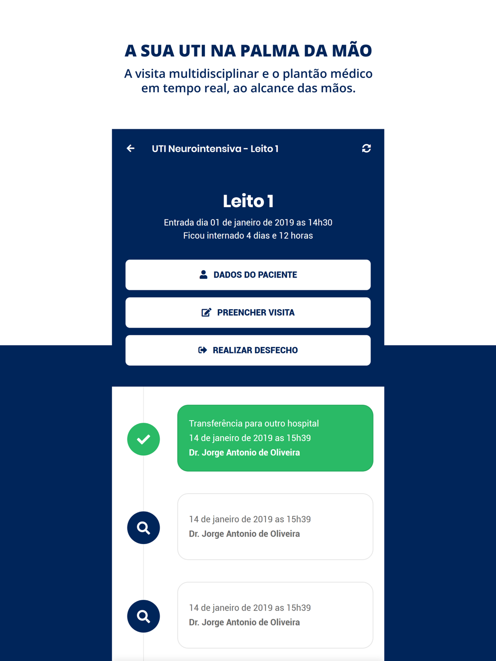 A visita multidisciplinar e o plantão médico em tempo real, ao alcance das mãos. Ferramenta simples e segura para facilitar o registro de dados durante o plantão e a visita multidisciplinar. Evite a perda de informações durante a passagem de plantão e torne a comunicação clara e eficiente entre os membros da equipe. Checklist de fácil preenchimento à beira-leito, customizável para adequar às necessidades específicas de cada unidade. Oferece o cálculo do SAPS 3 e SOFA.