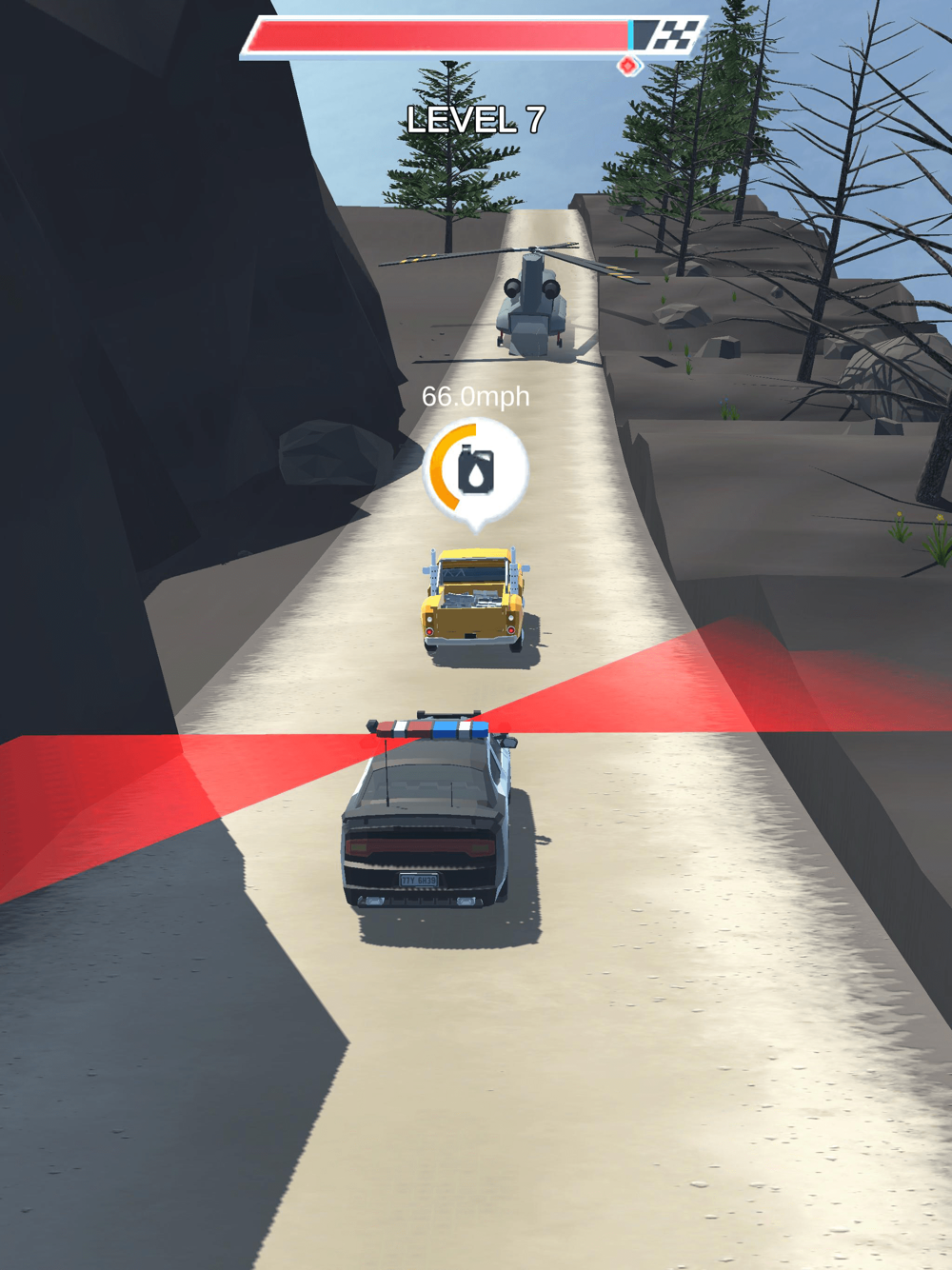 You’re low on gas and the police are close on your tail. If they catch you they will arrest you. Tap the screen to step on the gas and release to let go. Decide when to accelerate or coast to save your fuel or speed away. Use your fuel wisely, reach the rescue helicopter and escape with the money!