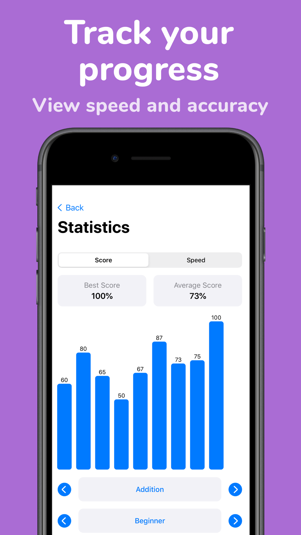 Are your curious to know if you improved your math skills already? We made it simple to tell by glancing at our statistics. You can view your best scores, your averages and your progress over time for each individual exercise and difficulty level.