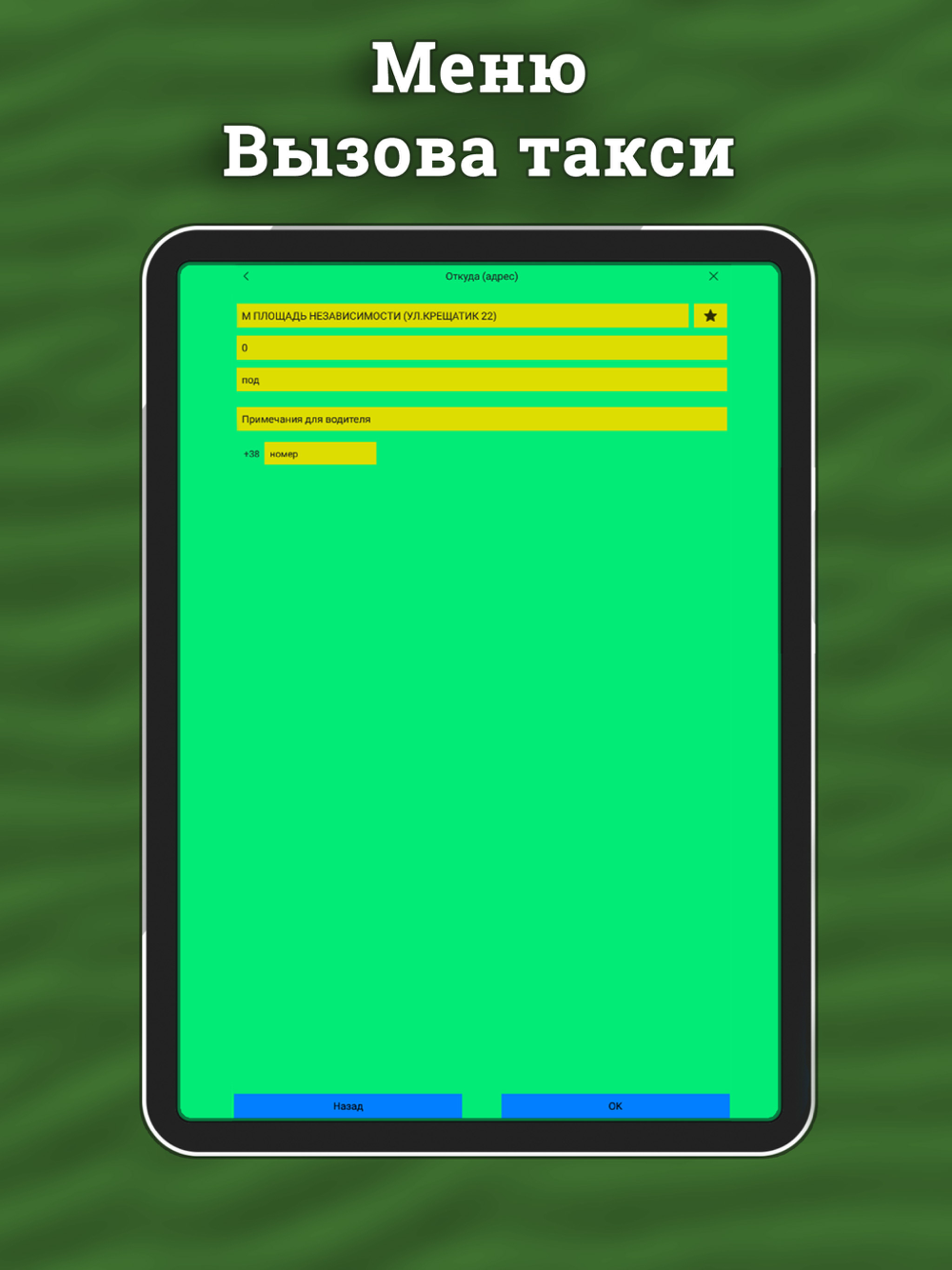- Хранение истории заказов (позволяет повторить поездку или вызвать такси в обратном направлении).