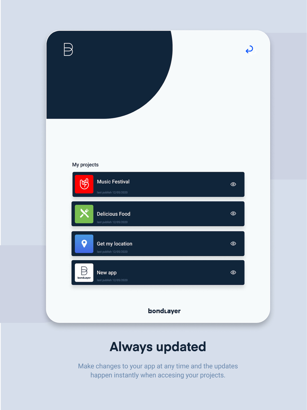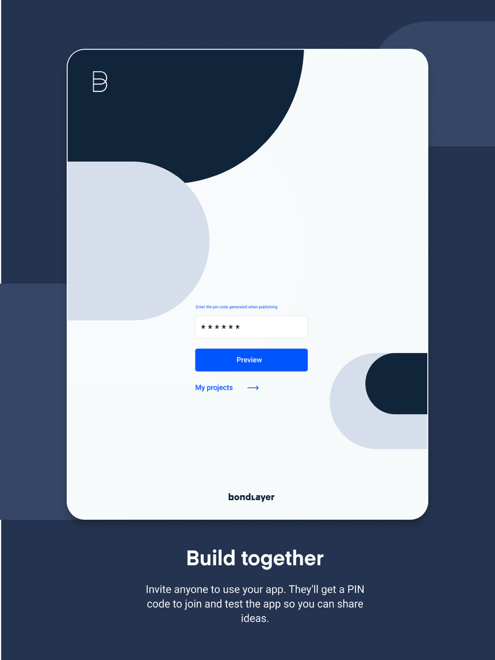 Bondlayer Staging App allows to preview and test your Bondlayer projects on your device. This app requires you to enter a PIN code available in the publish section of your project, login to your account (app.bondlayer.com) in order to see your projects.