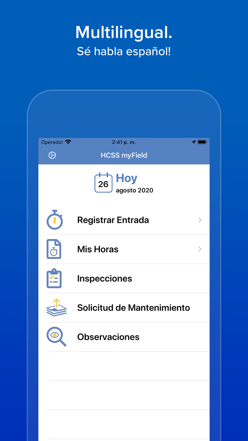• INSPECTIONS: Operators can complete equipment inspections faster and easier by simply tapping through checklists. Hundreds of job and equipment inspection forms are included in English and Spanish (requires HCSS Safety).