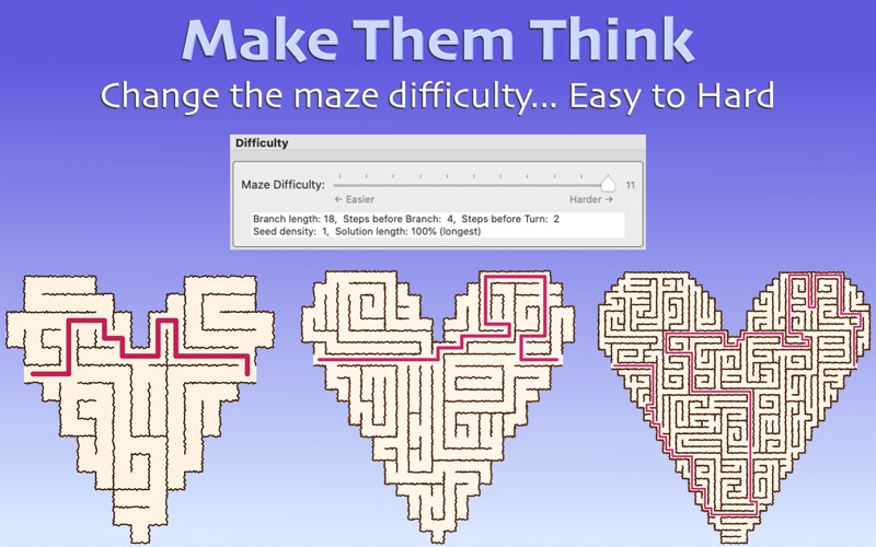 * Quickly change the maze difficulty. Simply move a slider from "very easy" mazes to "very hard" mazes, without worrying about all the details.