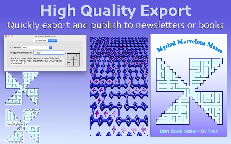 * Quickly export high-quality images of your mazes and solution keys for layout/publishing in your own books, newsletters, social media/blog, or classroom handouts… Lite version supports PNG, Full version also supports PDF, JPEG, SVG, and POV-Ray file formats.