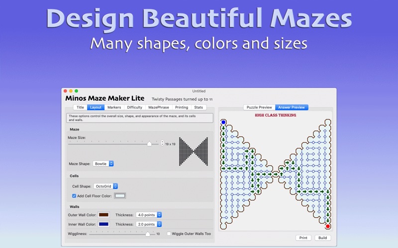 Custom Detailing - Personalize your mazes by choosing your own wall colors, thickness, and wiggliness, move the start and end spots anywhere, choose different solution path display styles, etc.