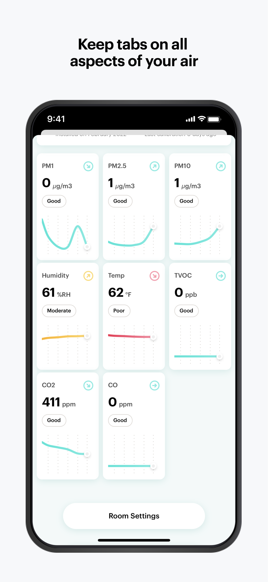 - Track 9 air quality factors including VOCs, humidity, temperature, and carbon dioxide