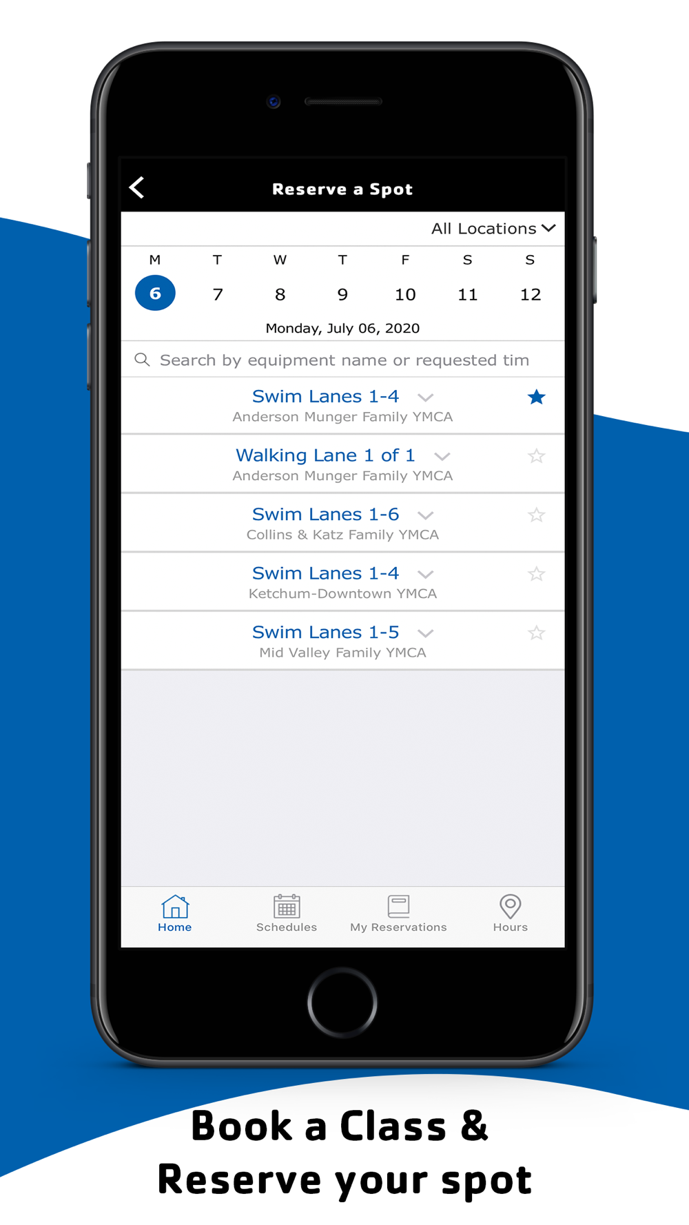 View, search and reserve equipment, classes, small group training, racquetball courts, personal training, and more.