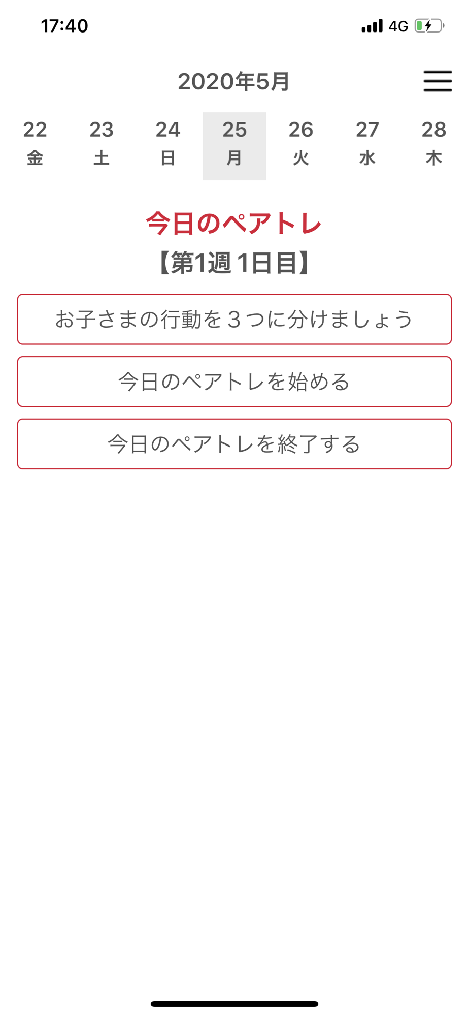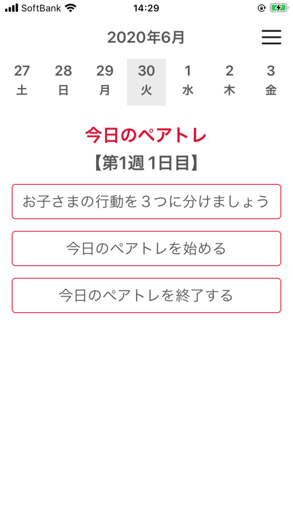 本アプリケーションでは、ペアレント・トレーニングを実践するための方法やペアレント・トレーニングに関するQ&Aなどを閲覧することができます。また、日々のトレーニングの達成度を記録することができます。