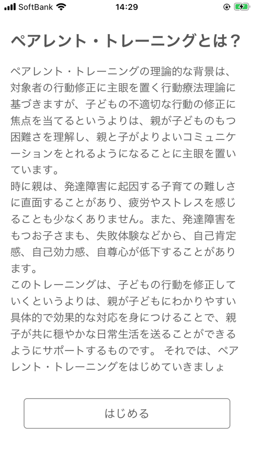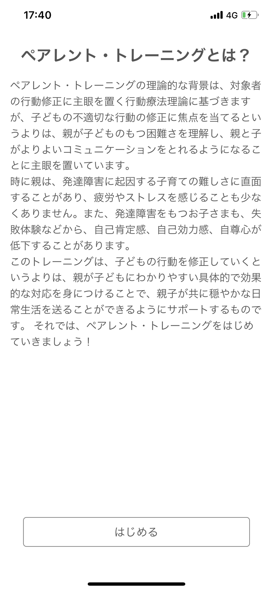 本アプリケーションは、育児をされている方のメンタルヘルスやお子様の発達等に対して、ペアレント・トレーニングがどのような効果をもたらすかを検証することを目的に作成された学術用アプリケーションです(個人向けアプリケーションではありません)。