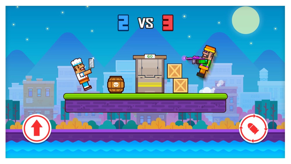 游戏的玩法很简单,通过左侧的按钮躲避对手的攻击,再利用右侧的按钮向对手射击。一旦被攻击到就会被击退,千万小心别被打到水里。