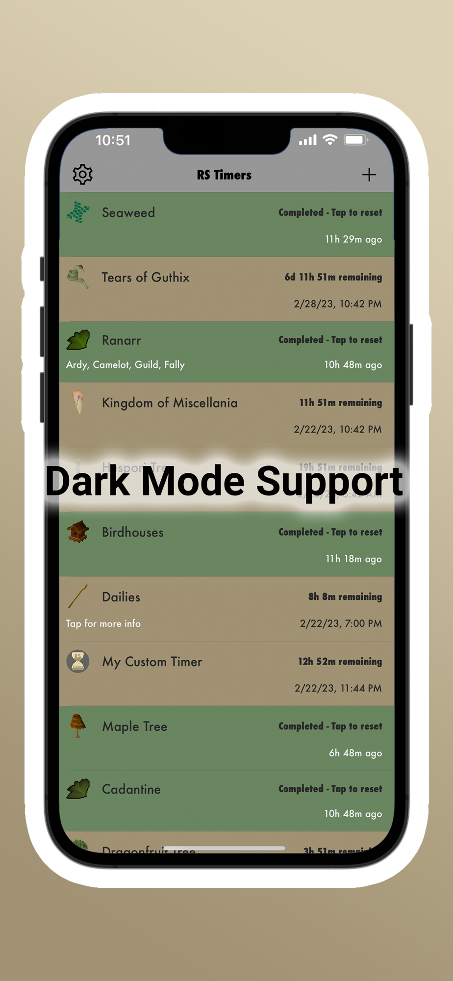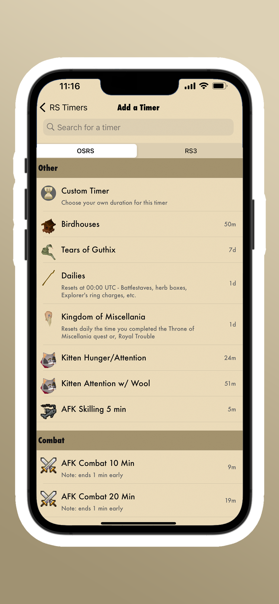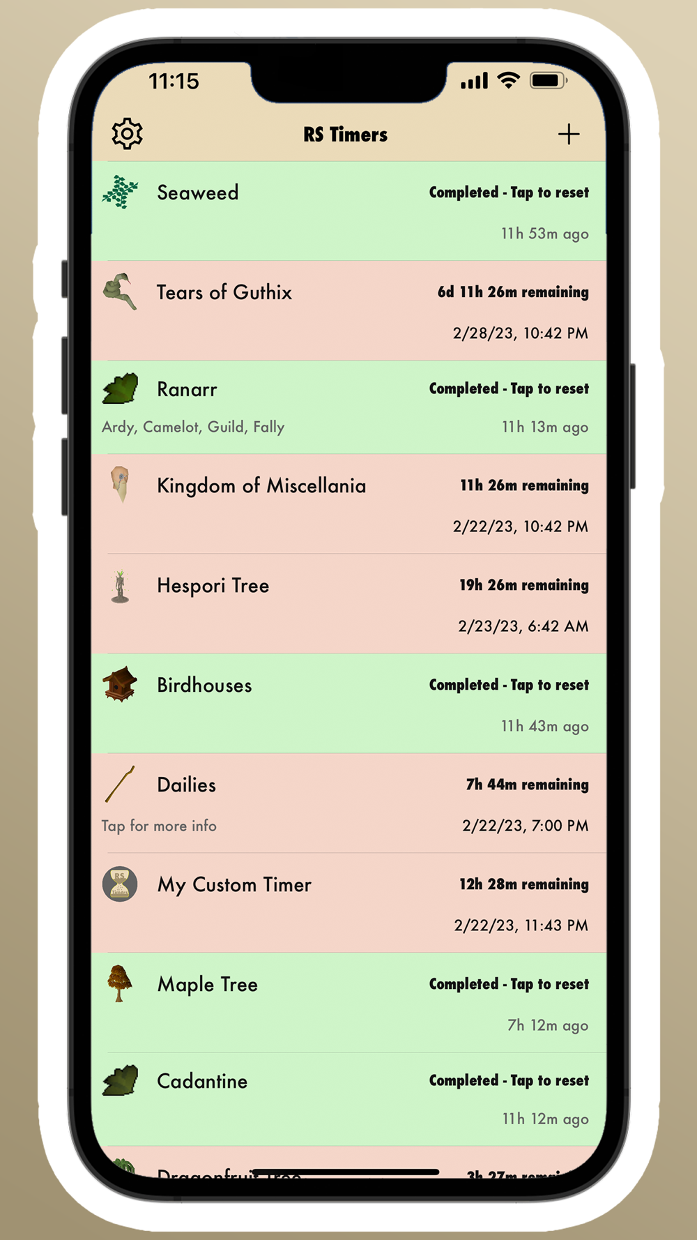 RS Timers brings a quick & easy way to keep track of all your RS3 or OSRS dailies. Simply add a timer, and you get a notification when that timer is up (with notifications enabled of course). Timers also sync between your iCloud devices automatically!