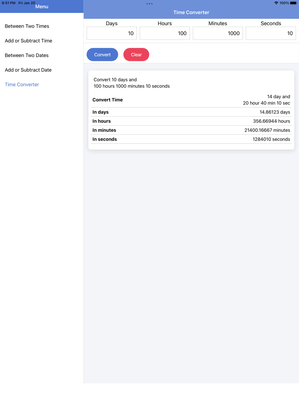 The entered time is displayed in day/hour/minute/second, converted to days, converted to hours, converted to minutes, or converted to seconds.