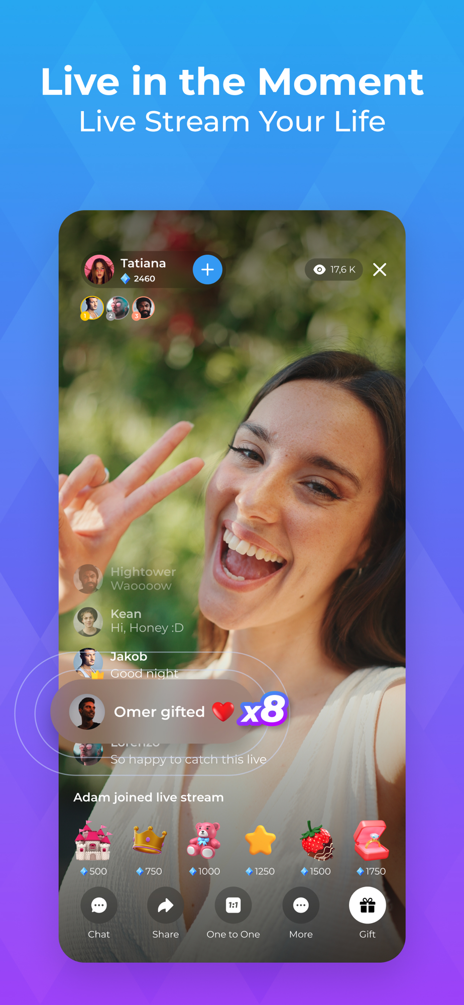 Join the most entertaining live streams from around the globe and participate in the show. Meet with new people online and improve your social circle. Follow each other, send messages and gifts, and talk to each other. Explore new communities and multiply the fun!
