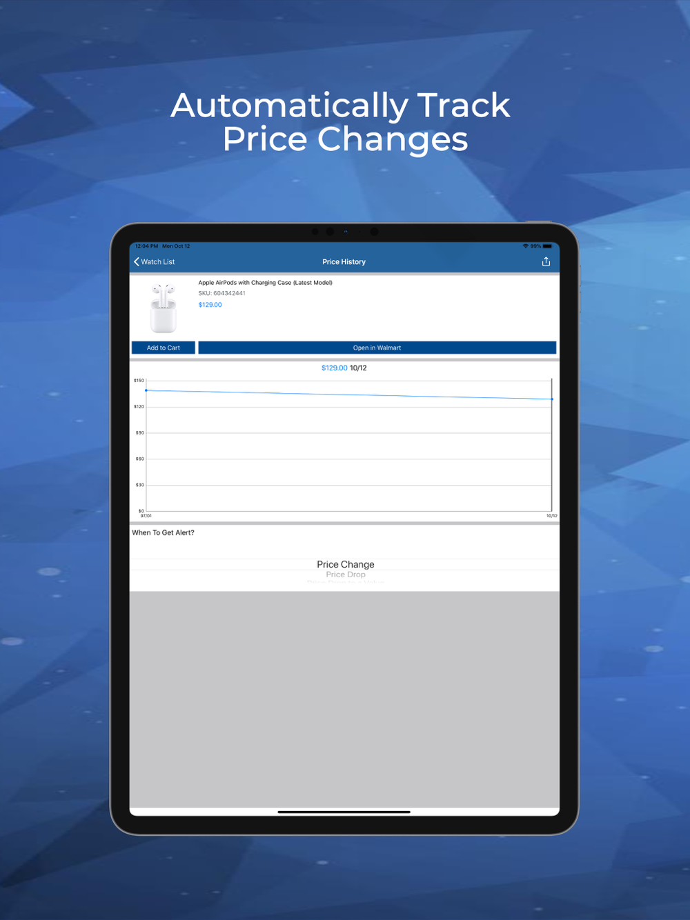 Add products from the Walmart.com to the watch list and track their prices. Price history tracking updates anytime items are viewed in the app.