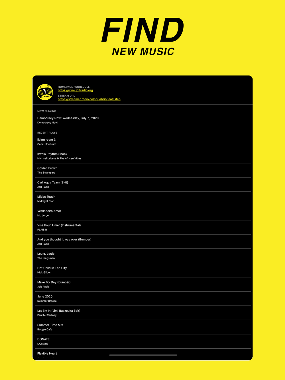 The official Jolt Radio app. Listen to the eclectic mix of music from world class DJs broadcasting from our studios in Miami.