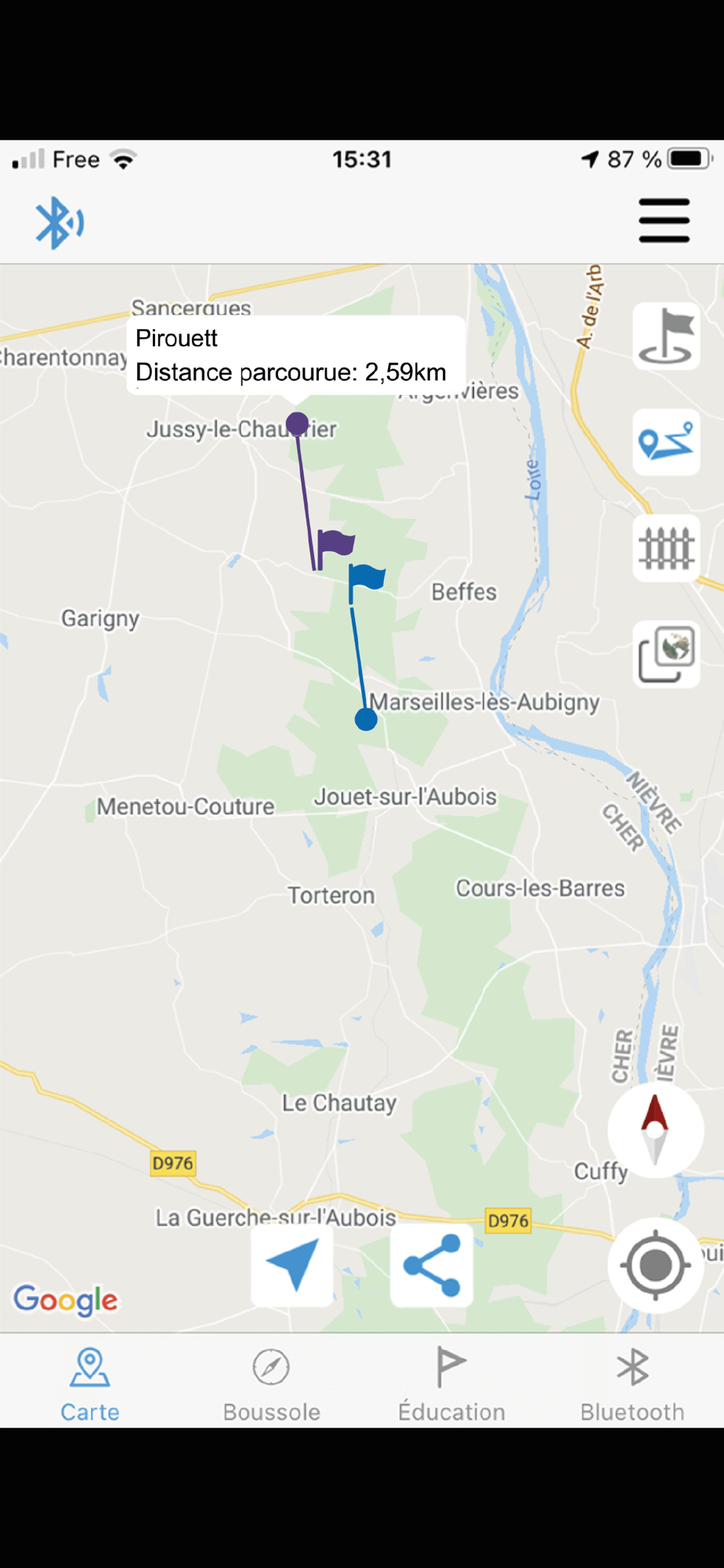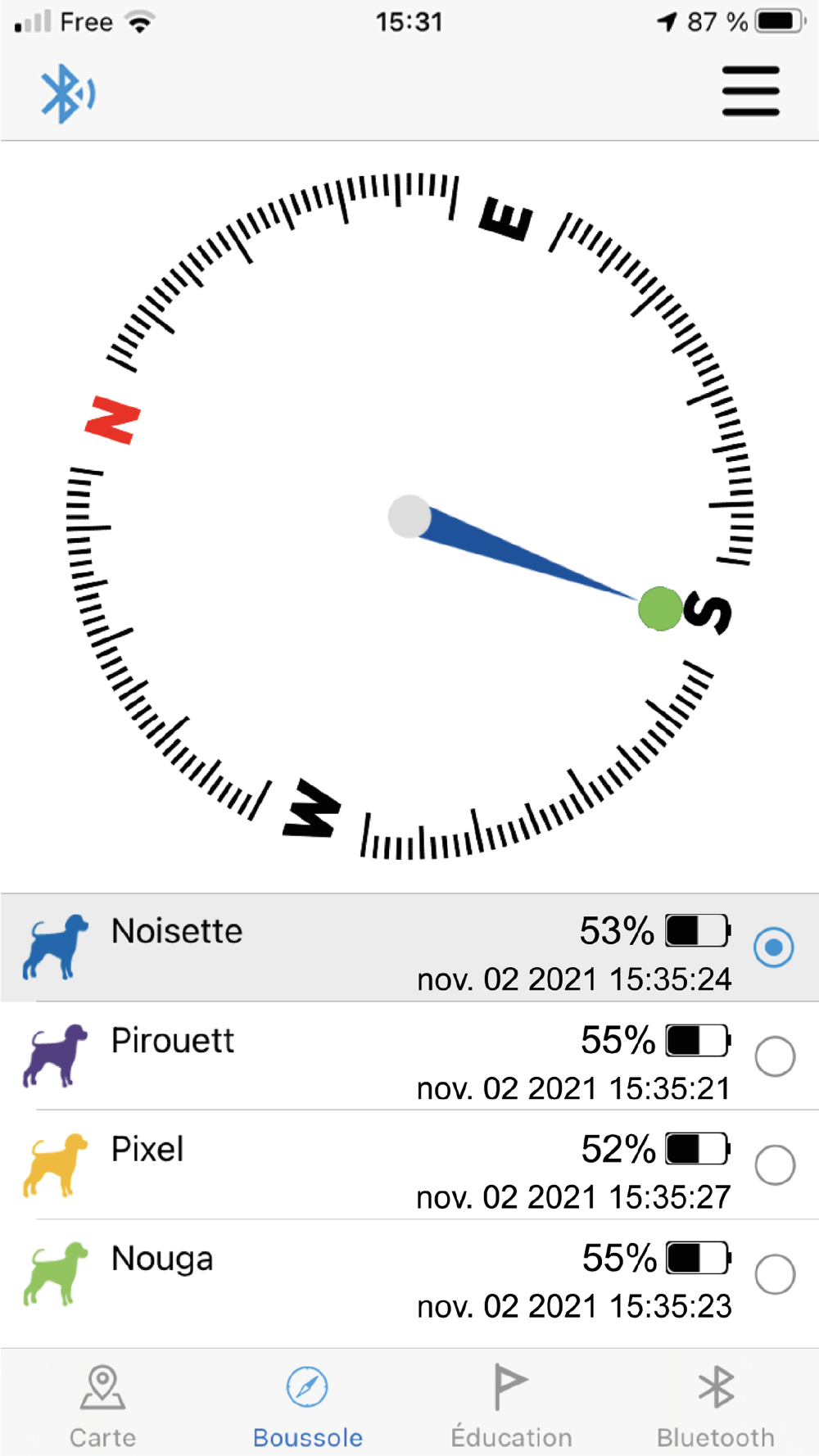 The Canicom GPS application displays your position and the position of your dog(s) on a map or satellite view.
