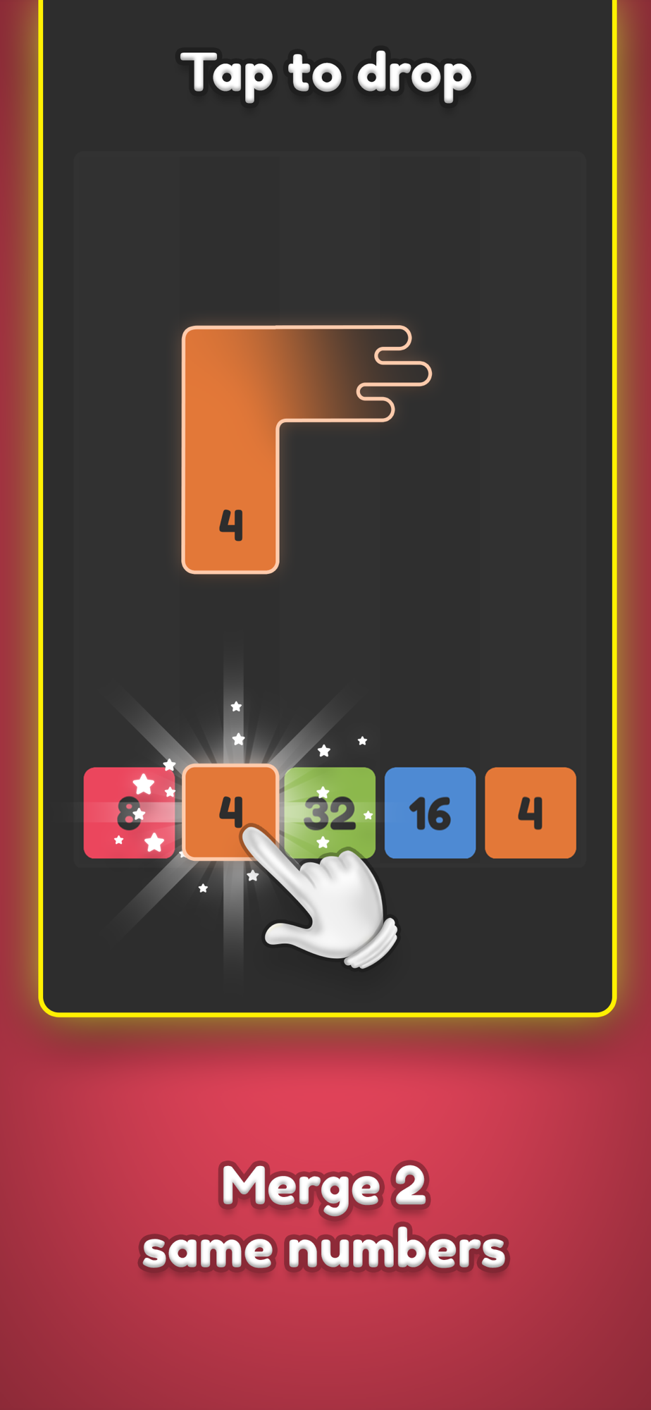 A number brick will be generated on the top. Click to make the brick drop a specified space. At least 2 identical adjacent number bricks can be merged into a larger number.