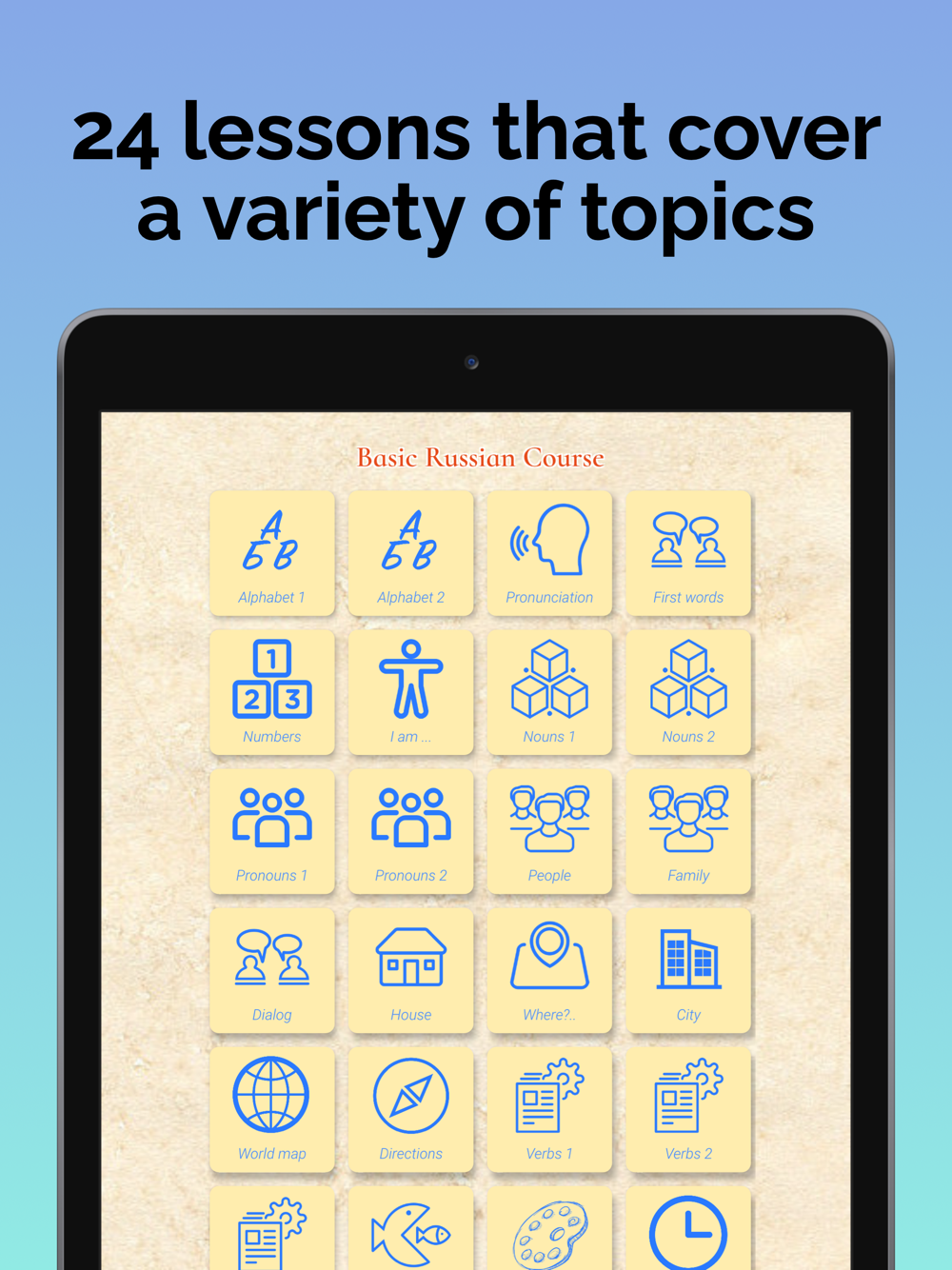 A basic course of Russian language. There are 24 lessons that cover many topics: from Russian alphabet to simple words and phrases to complicated grammar rules. The following parts of speech are covered: nouns, pronouns, verbs, adjectives, adverbs.