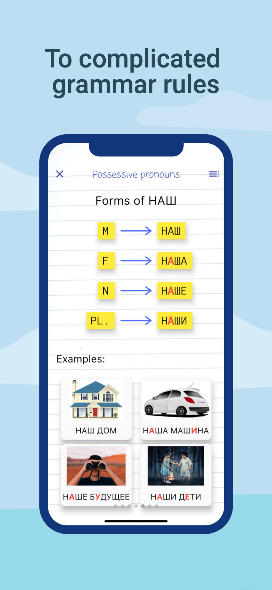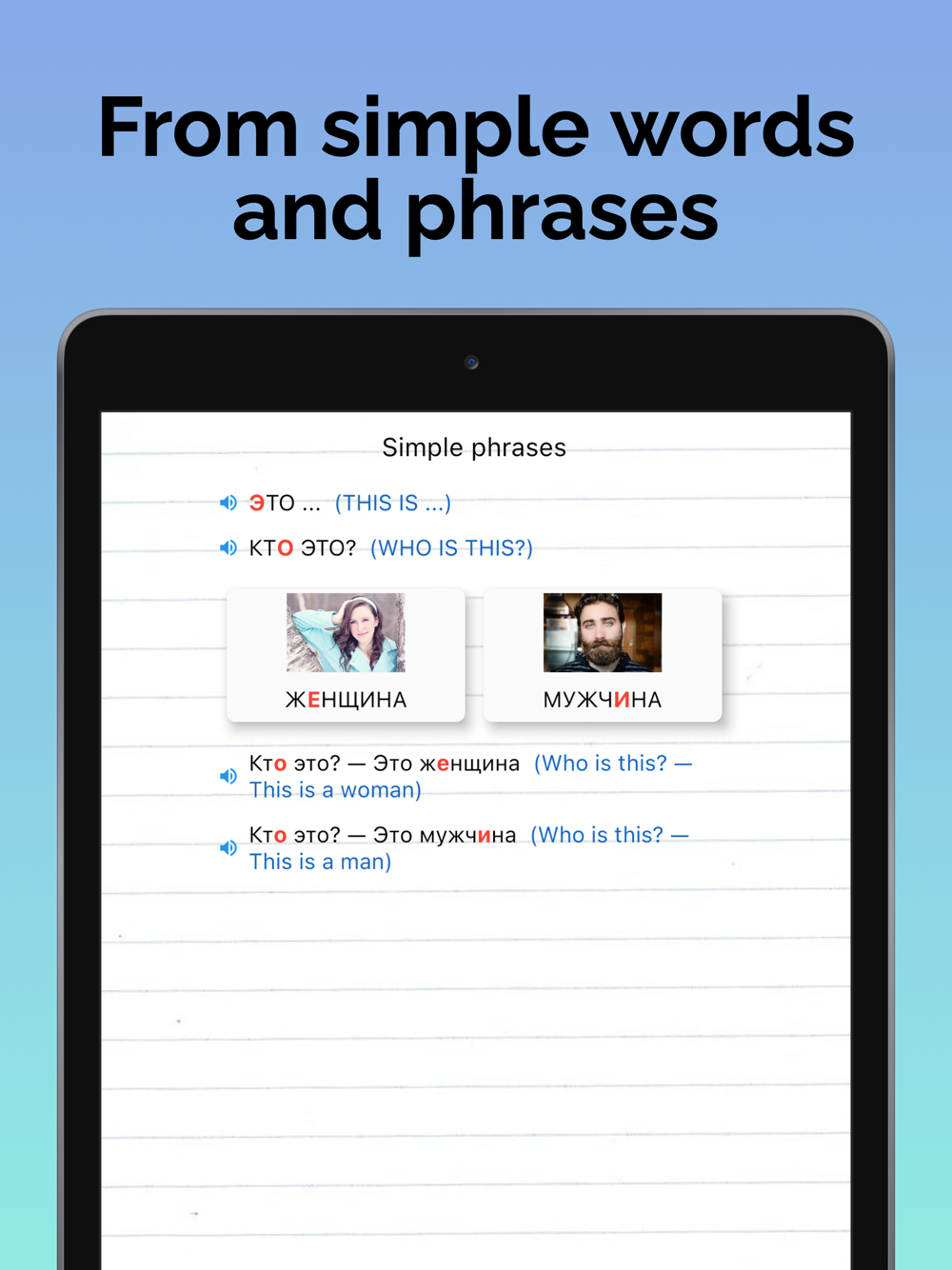 Each lesson includes multiple tests that help you monitor your progress and verify your knowledge of Russian language. There are tests for listening comprehension, grammar knowledge, typing Russian words, etc.