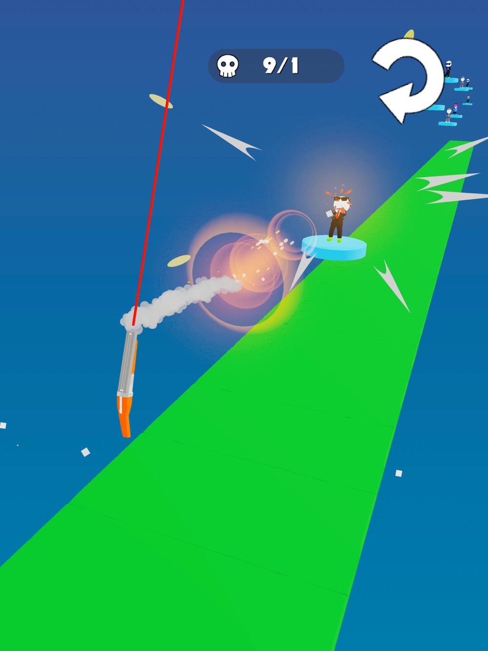 Flip the shotgun opposite direction of itself by shooting. if you hold your finger down slow motion will help you to aim easily. Kill 'Em All. Have Fun! :)