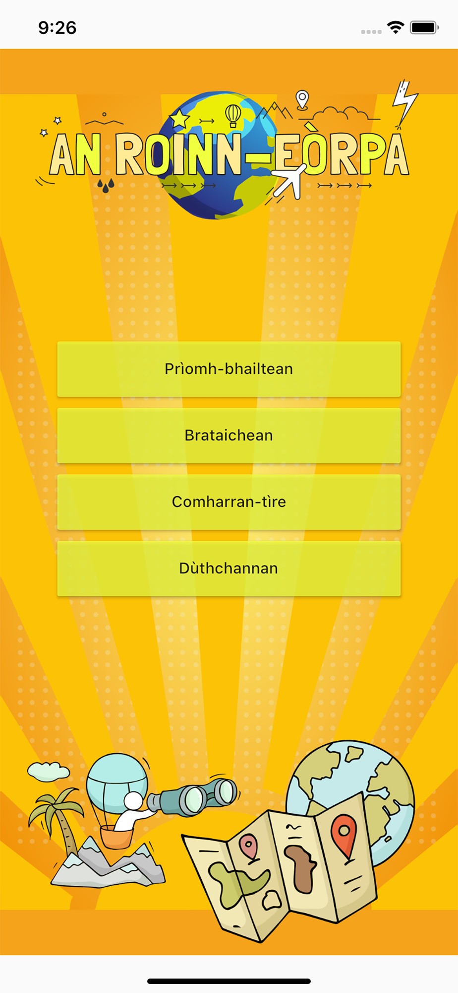 Tha ceithir geamaichean ann a bhios a’ measadh an eòlais a th’ agad air prìomh-bhailtean, brataichean, comharran-tìre agus cumadh dhùthchannan, le gach fear aig dà ìre de dhuilgheadas.