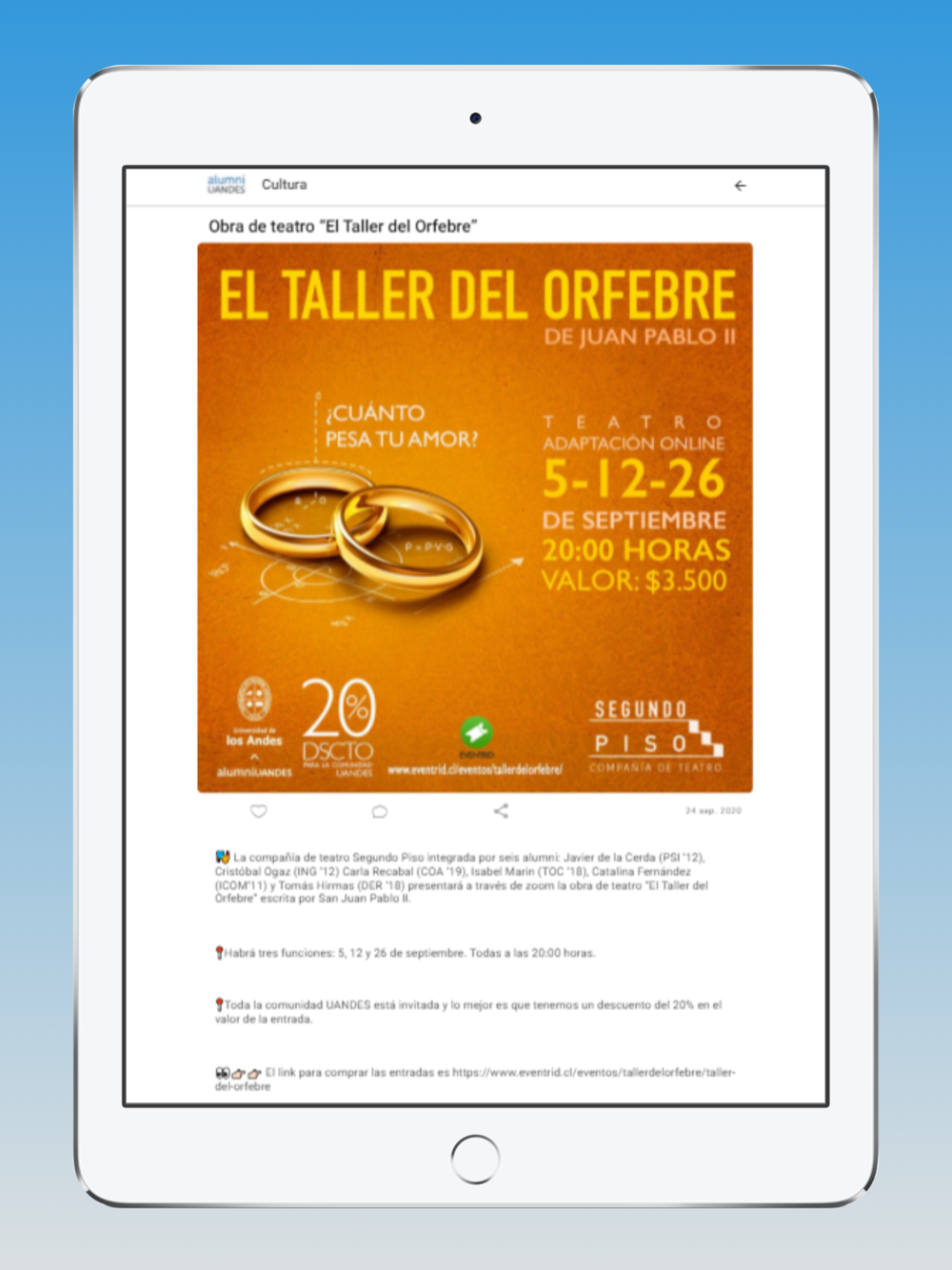 Presentamos una aplicación exclusiva para los egresados de la Universidad de los Andes, a través de la cuál podrás hacer networking con tus compañeros de generación, saber dónde están trabajando, apoyar o entregar apoyo a otro alumniUANDES, dar a conocer tu emprendimiento, estar conectado de manera cercana con personas que tú o tu empresa puedan necesitar. Existen grupos por áreas de interés con todas las generaciones y carreras, puedes estar informado acerca de lo que actualmente ofrece cada carrera a sus egresados. Todo esto y mucho más.