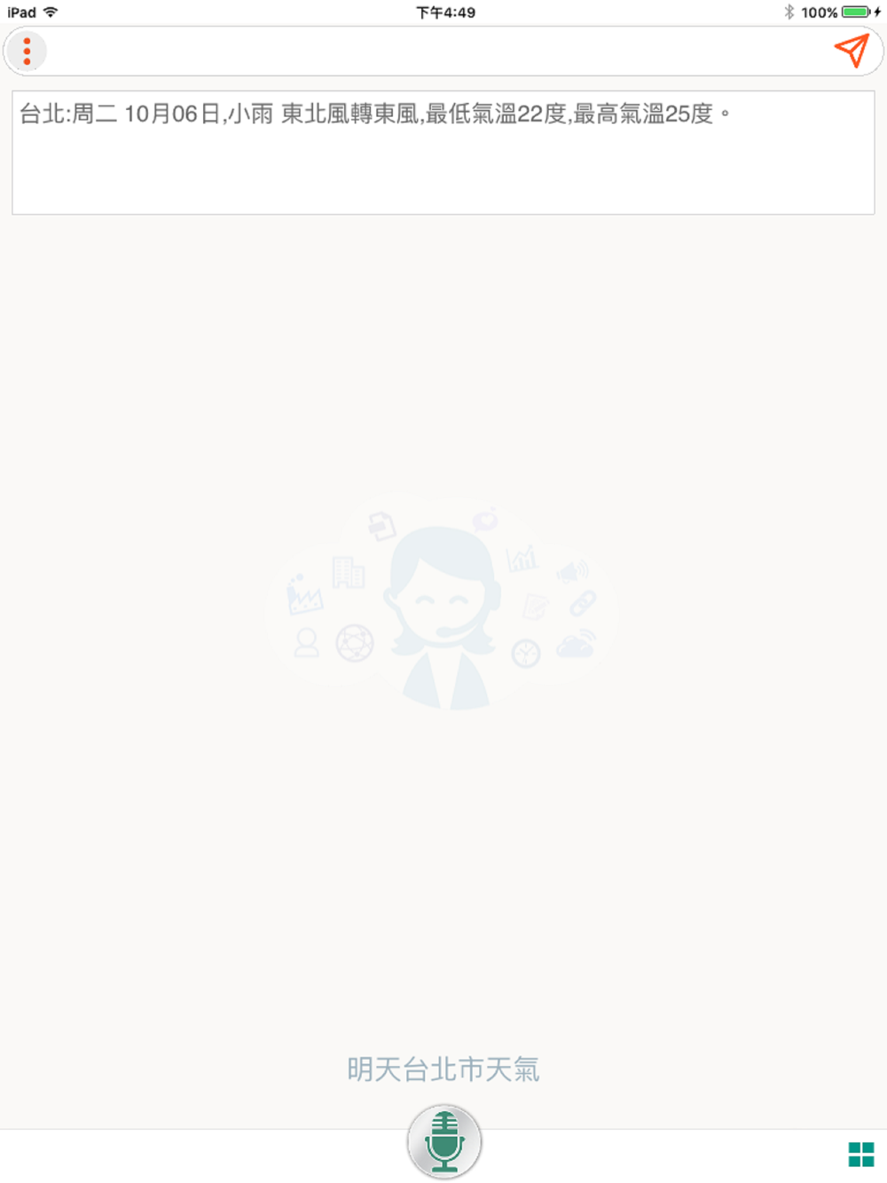 AI助理是一款語音互動機器人展示APP,主要是提供一個語音對答的體驗環境,讓對於AI語音應用有興趣的使用者去做體驗。APP內容除了具有基本的聊天功能外,也加入了一些企業內部假想的營運資料,讓使用者可額外體驗工作加上AI助理的方便性。