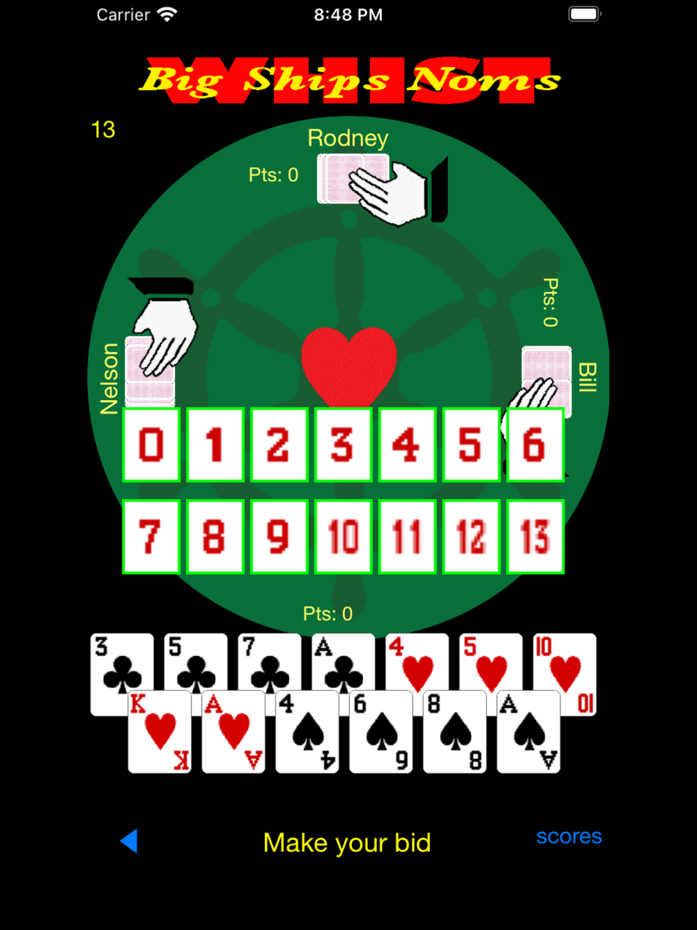 Big Ships Noms is a four player points-based trick-taking game where players must nominate (or bid) how many tricks they will win in each hand. There are twenty-five hands in each game with the number of cards varying from thirteen down to one and back to thirteen again. Points are awarded for each trick won with a bonus of ten if you make your bid in a hand. At the end of the twenty-fifth hand the winner is the player who has accumulated the highest number of points during the game.