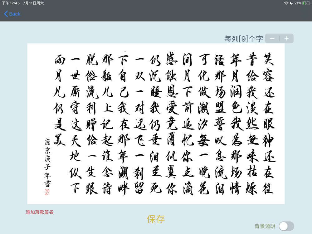本排版软件可以将ZenBrush上书写的多页作品进行合并,合成长篇书法,同时能够方便的进行不同样式的排版。比如,控制一列几个字,长和高的宽调整。