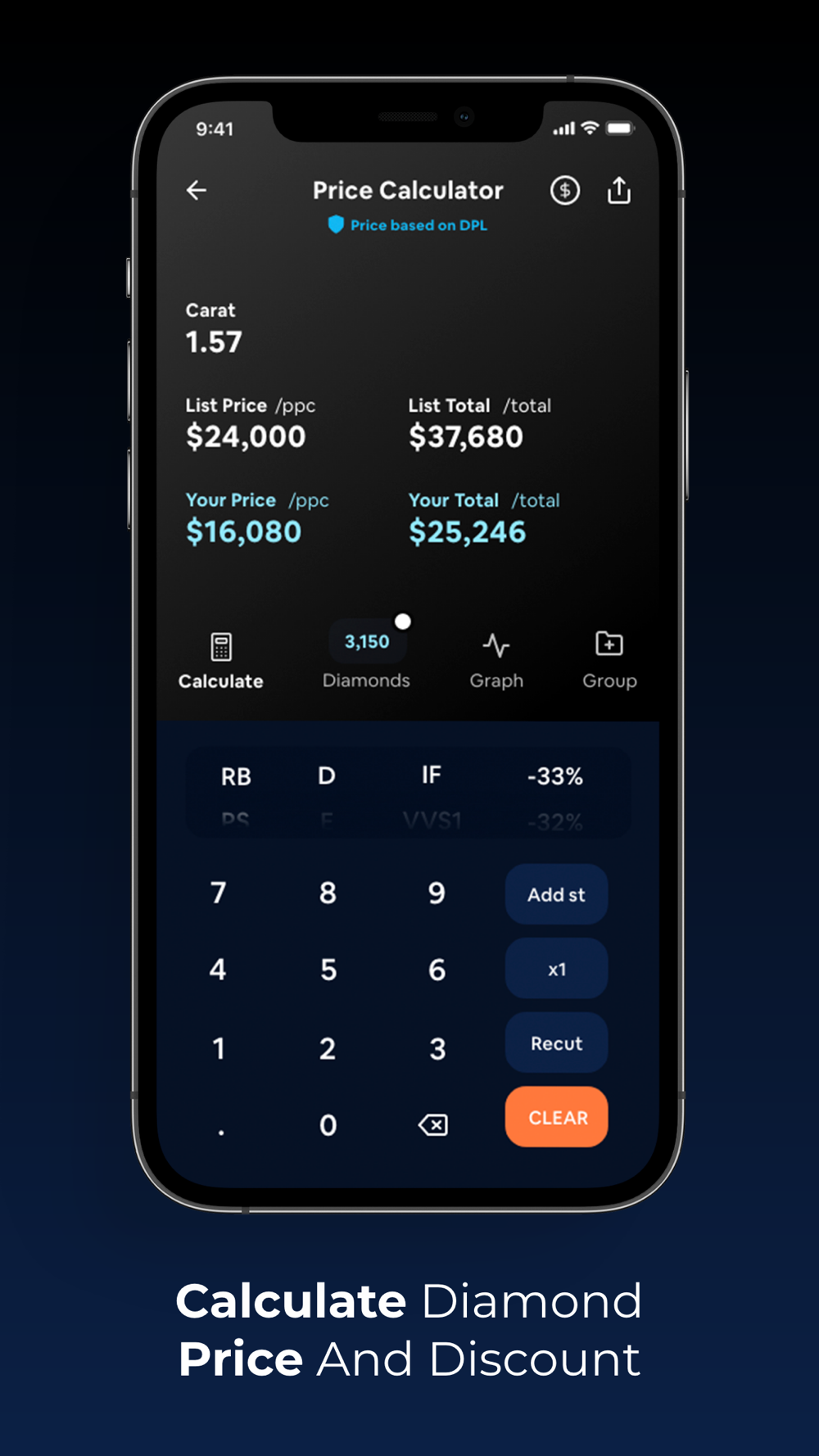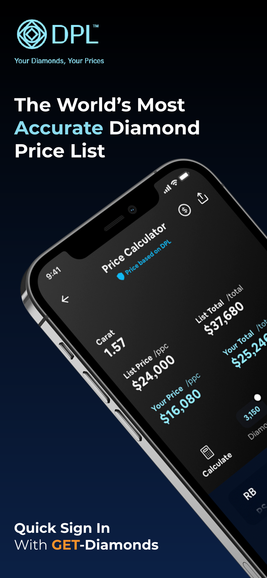 Get access to the latest Diamond Price List from within the App, anytime and anywhere. Use multiple options for calculating diamond prices based on selected parameters, and benefit from powerful, unique, trade support functionalities.
