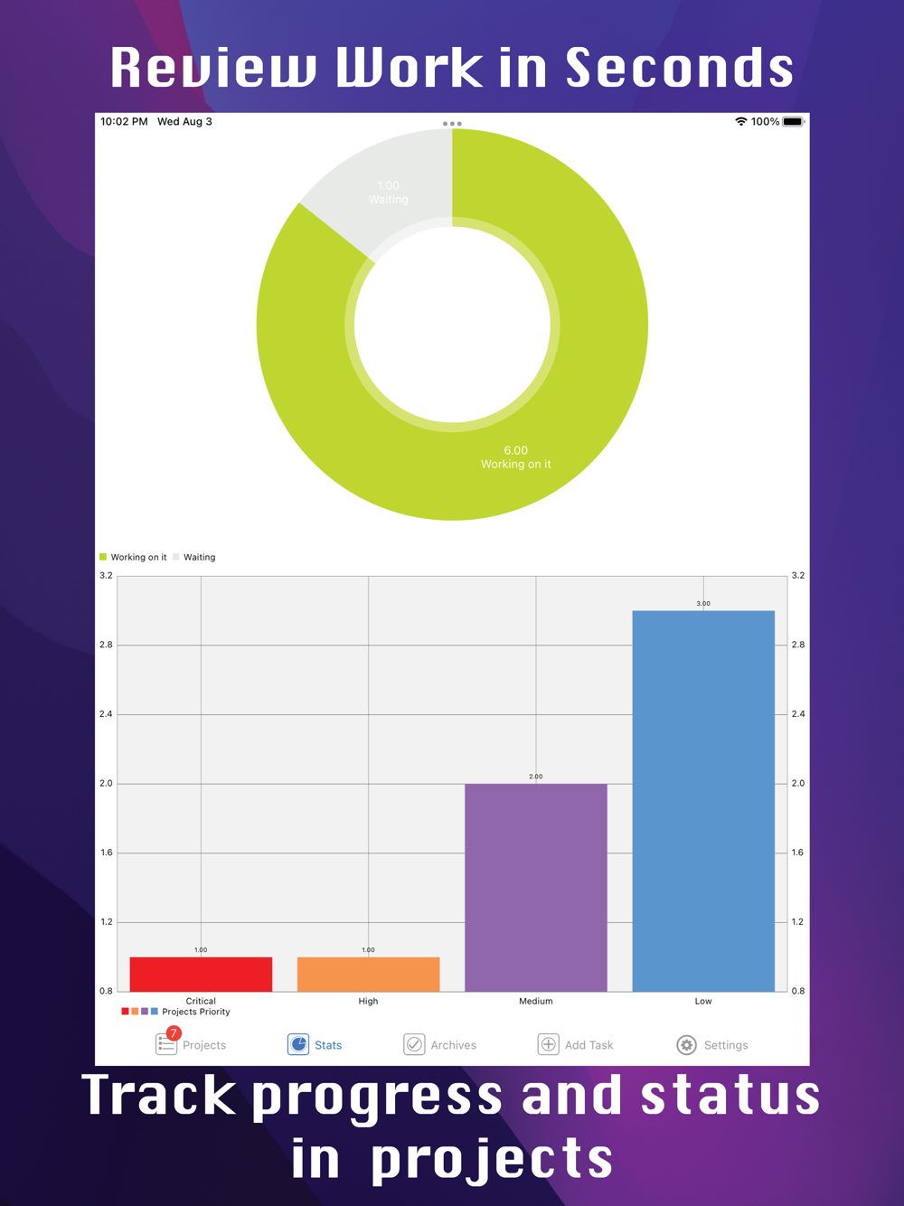 Graphically overview your work in seconds while staying focused on your work/task on hand. Each project provides unlimited log entries to record progress at every state or change.