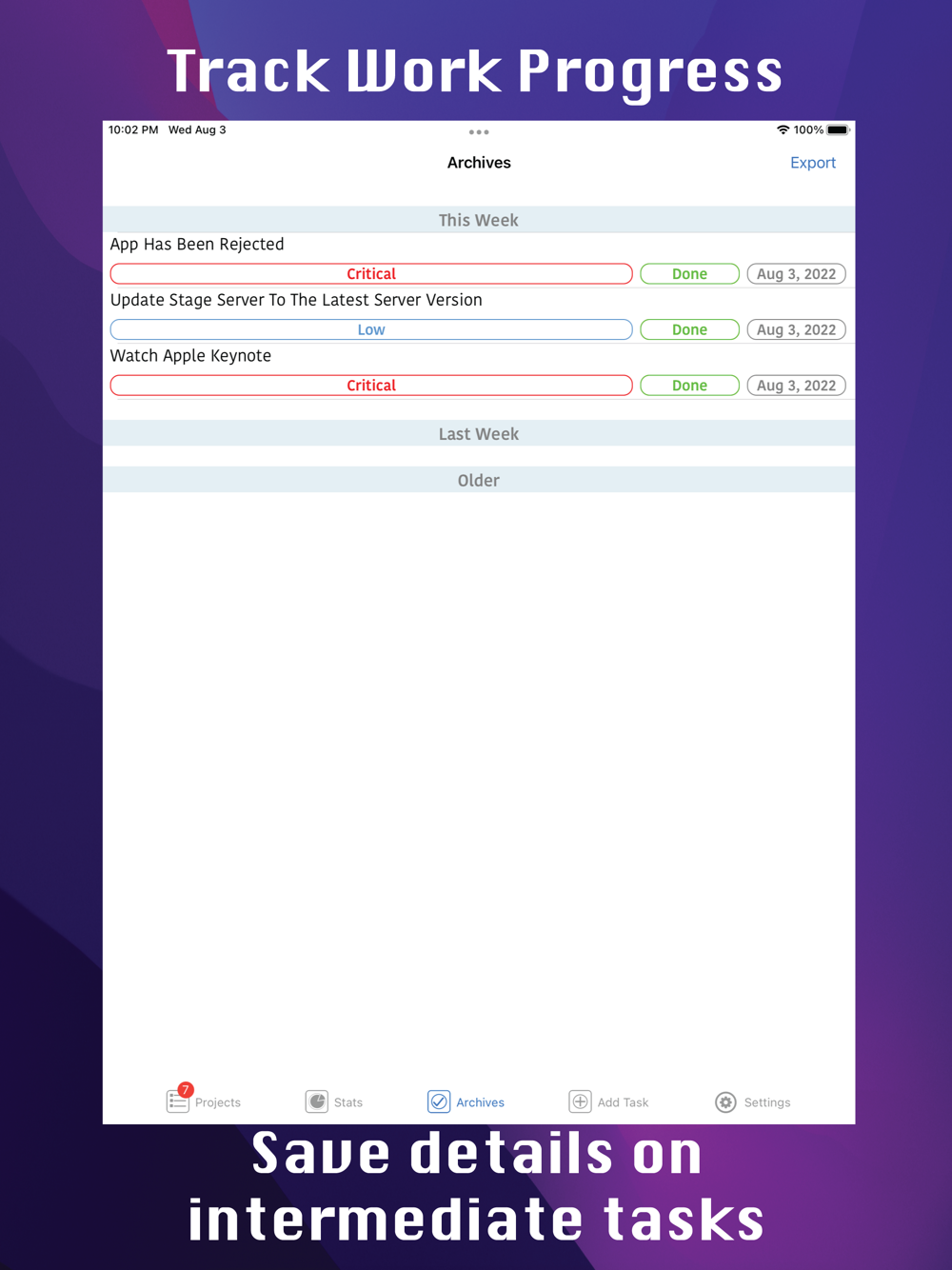 Easily categorize finished projects along with all its accomplished tasks. Done* and Rejected* status provides hint that a project has been completed; project is sent to the Archives tab. App also provides an option to easily save and export archived projects externally as a PDF file.