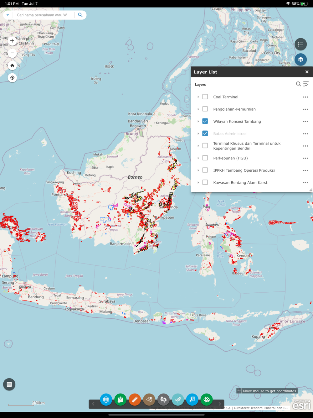 This application displays all mining business activities (permits and contracts) that are registered at the Directorate General of Mineral and Coal, Ministry of Energy and Mineral Resources. Only active and valid mining permits are shown in MOMI.