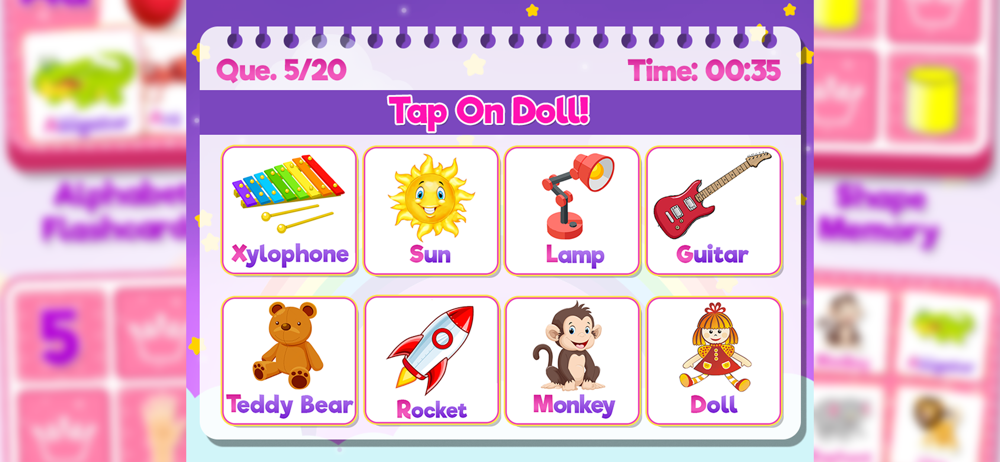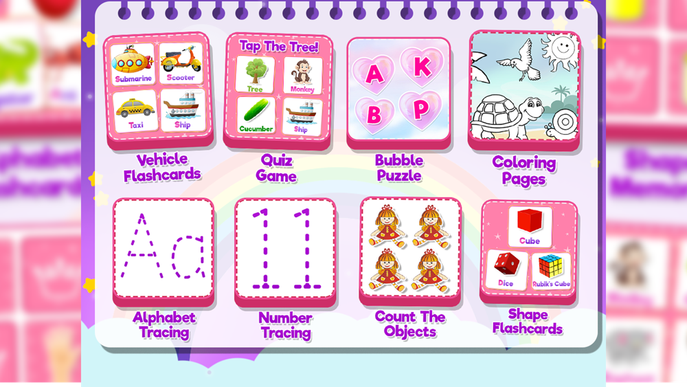 Game has a collection of FUN & EASY to learn the alphabet, numbers, colors, shapes, animals, musical instruments, days & months, Also included in this app are coloring pages, puzzles, the bubble game, and a quiz.